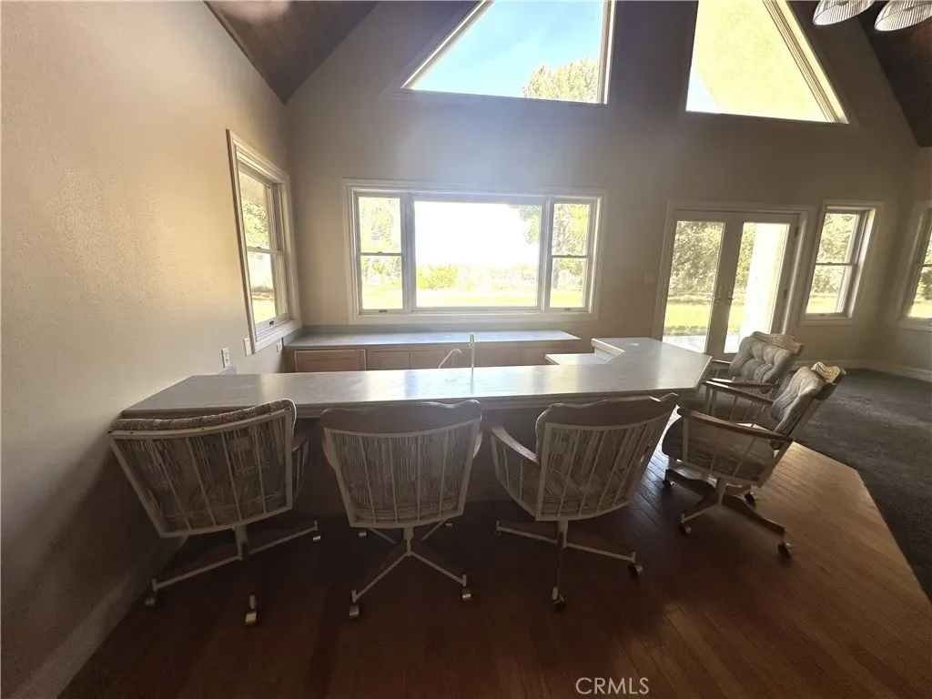 The main residence spans roughly 5,000 square feet and showcases soaring 20-foot vaulted ceilings, creating an open and inviting atmosphere throughout the expansive living areas. Highlights include a double-sided fireplace, an elegant bar complete with a refrigerator and wine storage cabinetry, and beautifully appointed finishes throughout. Bathrooms are enhanced with tinted mirrors and shower enclosures, complemented by stylish sinks and fixtures. Additional interior features include two spacious cedar-lined closets, chandeliers throughout, a functional intercom system, and a well-equipped kitchen with dual ovens, two dishwashers, and abundant cabinetry.