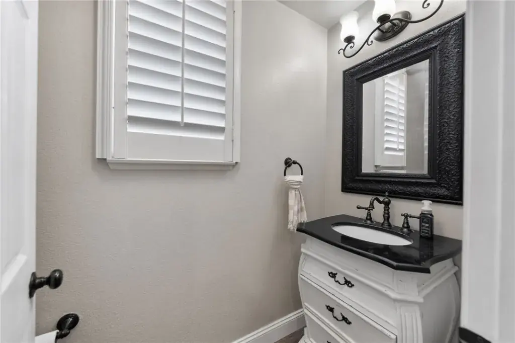 The main level features LVP flooring, abundant natural light, recessed lighting, plantation shutters throughout, and stylish farmhouse-inspired fixtures. The inviting entry showcases a custom shiplap accent wall leading to the downstairs half bathroom. The separate laundry room is also conveniently located on the main floor. A formal dining room flows seamlessly into the open-concept family room, highlighted by a cozy fireplace and built-in seating with storage. The gourmet kitchen is designed for both beauty and function, complete with granite countertops, a spacious island, soft-close drawers, pull-out pantry shelves, a farmhouse sink, lazy Susan, and a pot filler above the stove.
