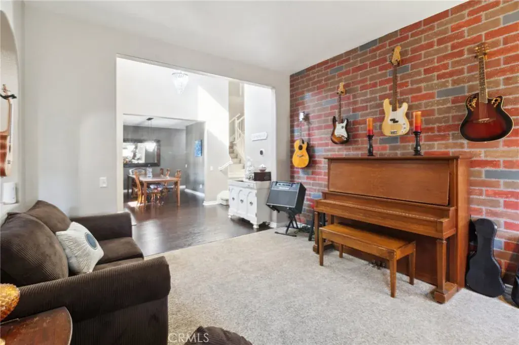 The floor plan also includes formal living and dining rooms, offering additional flexibility for entertaining or more traditional living arrangements. Throughout the home, upgrades include laminate wood flooring, custom paint, textured accent walls with wood and faux brick details, plantation shutters, and ceiling fans.