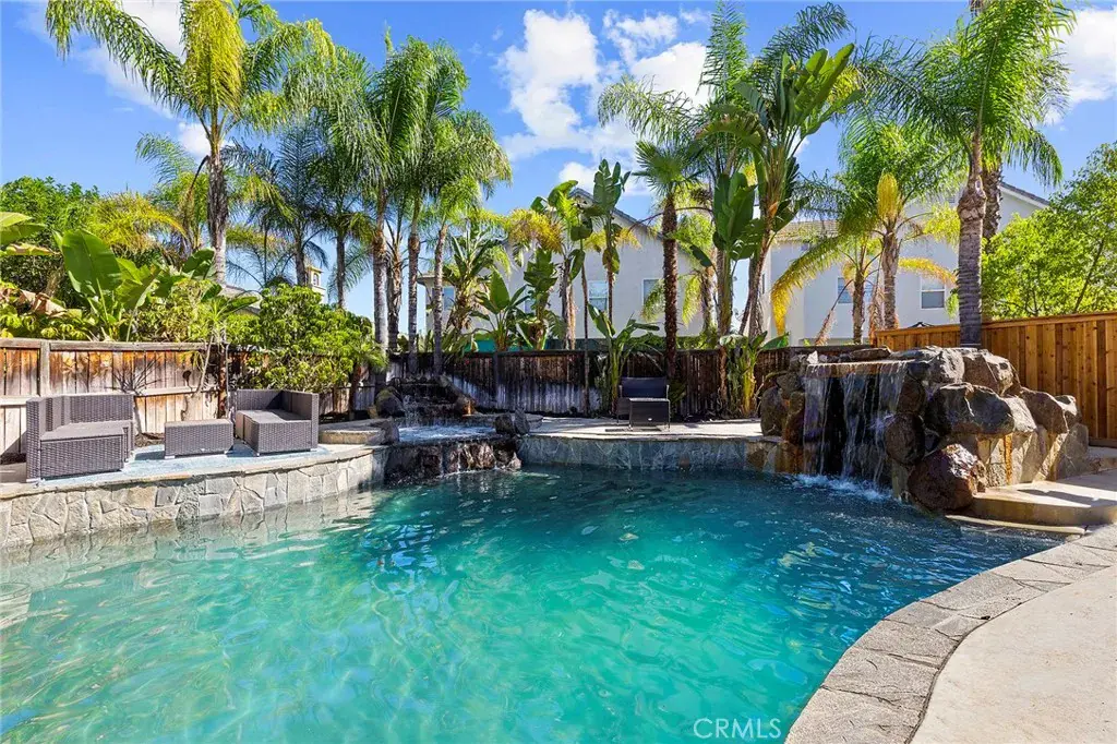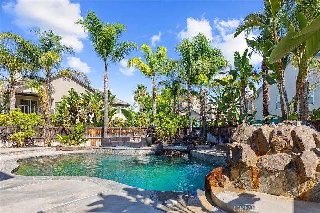 Newly Remodeled and painted Pool Home with Paid Solar and No HOA !! Enter into your own private oasis with this stunning 3-story, 4,150 sq. ft. home, where the highlight is the resort-style backyard. The outdoor space is a true retreat, featuring a tiered patio that overlooks a sparkling Pebbletech pool and spa, surrounded by real rock formations and a cascading waterfall. Perfect for year-round enjoyment, the backyard also boasts a glass fire pit, a built-in barbecue for outdoor dining, and lush tropical landscaping with palm trees and stacked stone planters. Whether you’re entertaining or simply relaxing, this serene oasis offers everything you need to unwind in luxury. Inside, the home continues to impress with 5 spacious bedrooms, 4 ¾ baths with an additional downstairs office that could be easily used as a bedroom totaling 6 Bedroom, and a private casita perfect for an in-law or generate additional income by using it as rental. This versatile space creates the perfect opportunity to boost your investment while enjoying the luxurious comforts of this expansive home. The entry greets you with charm through leaded glass doors, while slate floors, wrought iron lighting, and granite countertops provide a touch of elegance throughout. Surround sound in the dining, family rooms, and outdoors ensures that the entertainment doesn’t stop at the door. The second floor features a luxurious master suite, complete with its own sitting area, fireplace, and spa-like ensuite. The master bath includes granite countertops, double sinks, a deep soaking tub, and a large walk-in closet with natural light. Every bedroom is equipped with ceiling fans for comfort. The versatile third floor boasts a bonus room with a closet, perfect for a game room or extra guest space. Upgrades abound, including a whole-house fan, slate flooring, granite countertops, custom wine racks, and wrought iron stair rails. This home is designed for both comfort and entertainment, but the true gem is the backyard—a private oasis where relaxation and luxury await.