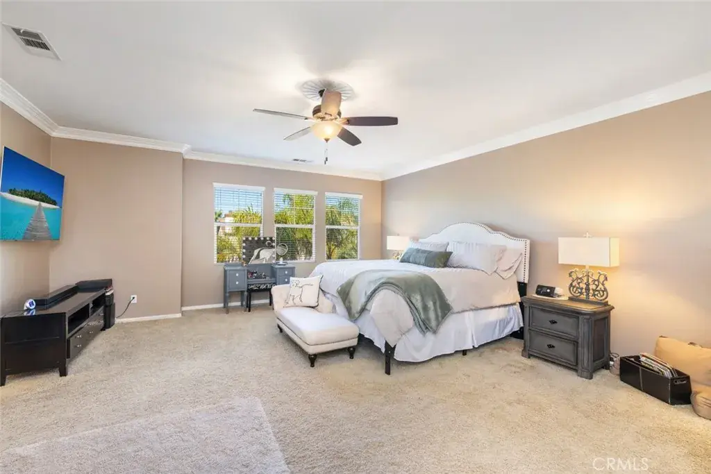 Don’t miss the opportunity to tour this exceptional 5-bedroom, 3.5-bath Murrieta Saltwater POOL HOME, offering true resort-style living with thermal solar to heat the pool for free, a soothing above-ground therapeutic spa, and a backyard oasis with fire pit and putting green that feels like a private getaway. This rare outdoor retreat includes beautifully designed custom landscaping, a tropical palapa, and a full BBQ island with bar seating, creating the perfect setting for gatherings, celebrations, or simply unwinding at the end of the day. From the moment you enter, the home impresses with soaring vaulted ceilings, fresh interior paint, abundant natural light, and an open, flowing layout that blends sophistication with everyday comfort. High-end touches are found throughout, including hardwood flooring, elegant crown molding, ceiling fans in every room, and plantation shutters that add both style and energy efficiency. The formal dining area sits conveniently off the kitchen and features a pass-through opening to the living room—ideal for hosting and maintaining a connected atmosphere between spaces. The expansive family room/great room is warm and inviting, highlighted by a custom flagstone fireplace, built-in entertainment center, and generous space for relaxing or entertaining. The chef’s kitchen has everything you need: granite countertops, stainless steel appliances, double ovens, custom tile backsplash, tile flooring, and an abundance of cabinetry for storage. A downstairs bedroom with a closet and its own flex/exercise space adds versatility, perfect for guests, a home office, gym, or multigenerational living. Upstairs, the luxurious primary suite features dual walk-in closets, dual vanities, and a serene soaker tub designed for unwinding. A highly desirable ensuite secondary bedroom provides privacy and convenience with its own full bathroom. Two additional upstairs bedrooms are generous in size and share a well-appointed hallway bath. The open loft offers endless possibilities—library, theater room, game area, reading nook, or additional living space to fit your lifestyle. Located close to shopping, restaurants, businesses, hiking, entertainment, the 15 and 215 freeways, and award-winning Murrieta schools, this home checks every box. With its stunning backyard, thoughtful upgrades, and beautifully maintained interior, thermal solar and solar for energy efficiency this home is the one you’ve been waiting for….schedule your showing today!