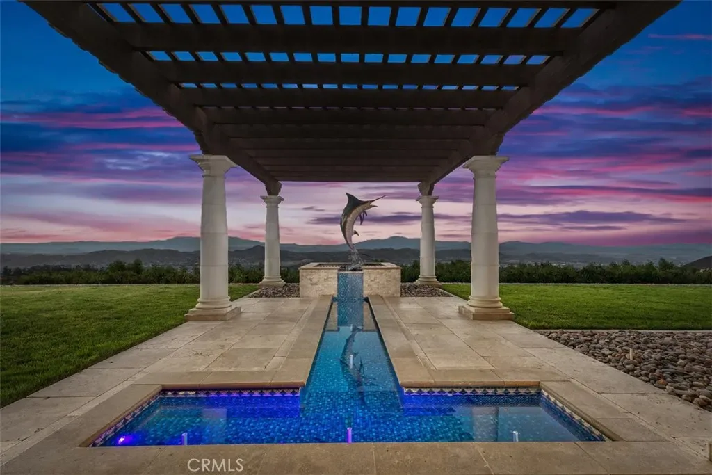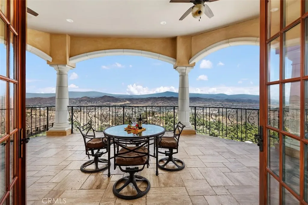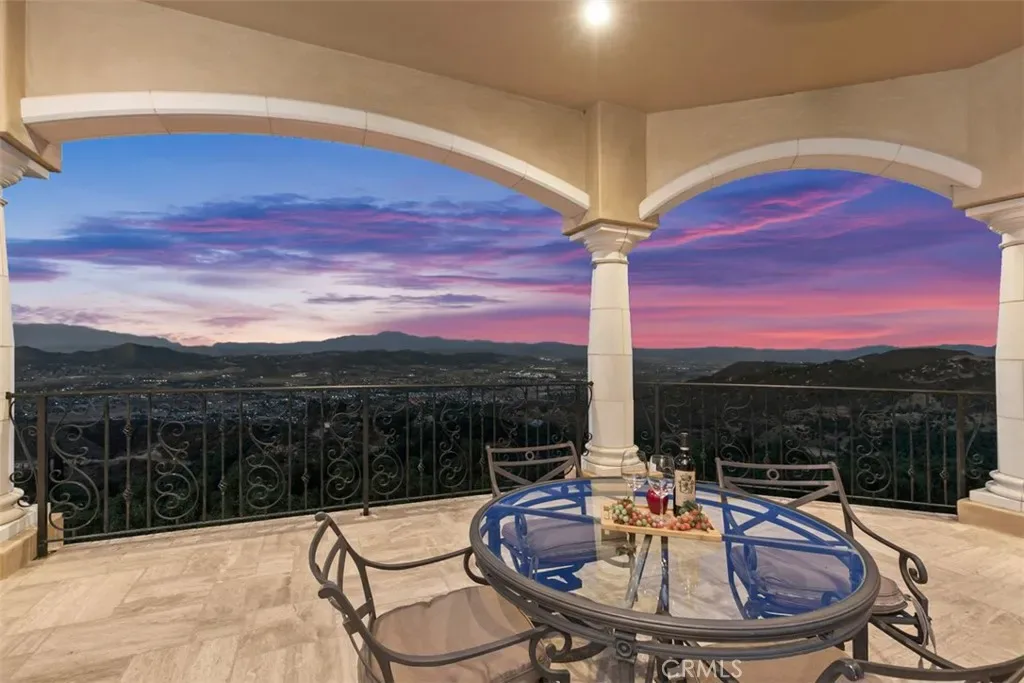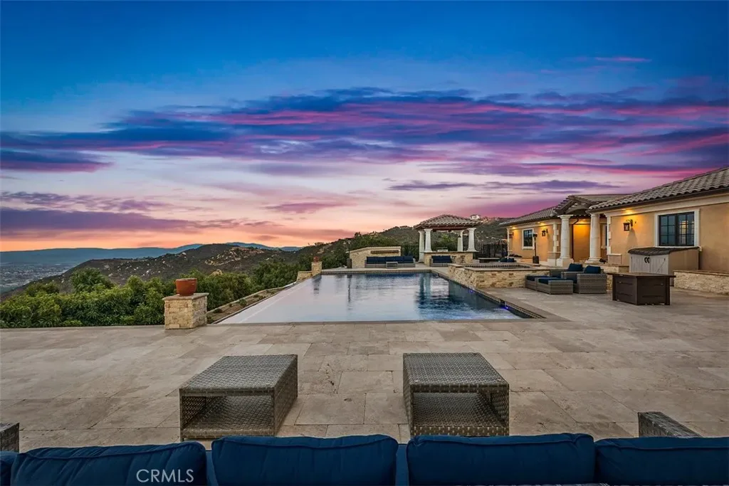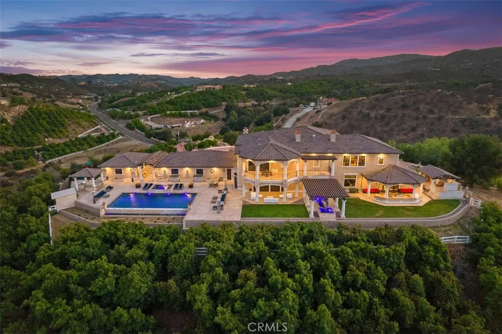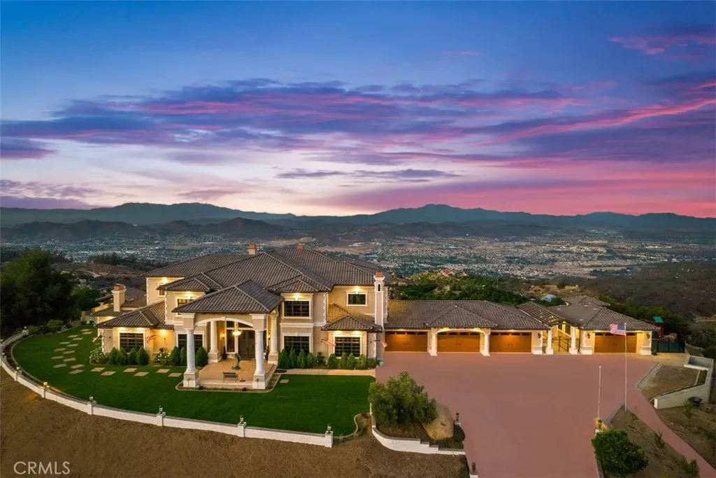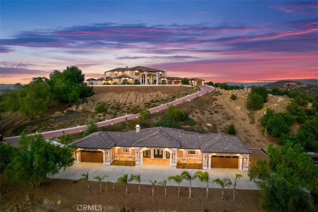 Welcome to Villa Dolce Vista. Commandingly positioned atop 20.39 ACRES at the north point of the EQUESTRIAN COMMUNITY of La Cresta, this Italian inspired masterpiece offers luxury amenities appreciated by the most discerning buyers. Impressive private GATED COMPOUND offers uninterrupted panoramic VIEWS of mountains, city lights, and the Temecula Valley. Encompassing nearly 14,000 SF, the resplendent home includes 5 EN-SUITE BEDROOMS, 8 BATHROOMS, a grand foyer with DUAL STAIRCASES and 24’ ceiling, elegant wood paneled STUDY, FORMAL DINING ROOM with fireplace and expansive city light view. Incredible CHEF’S KITCHEN includes a 20’ granite topped island, COPPER CEILING and LEDGER STONE WALLS. Extraordinary PRIMARY SUITE offers a FIREPLACE, BALCONY with staggering city light views, OPPULANT BATH with dual water closets, vanity areas, marble spa showers, and Jacuzzi tub. Massive GAME ROOM with full wet bar and access to the outdoor travertine deck with FOUNTAINS, INFINITY EDGE JEWEL SCAPE POOL AND SPA and two full outdoor BBQ kitchens. EIGHT CAR GARAGE with built in cabinetry. This SMART HOME is equipped with $155,000 in electronics that provides you with touch screen devices throughout the home. For extended family, a 1,777 SF SINGLE STORY 2 BEDROOM, 2 BATH BUNGALOW with two- 2 car attached garages. Energy efficient with a 47 KW 136 PANEL SOLAR SYSTEM powering both the main home and casita. 53’x40’ RV GARAGE totaling 2,120 SF for storage of two 45’ motorhomes plus all the toys. INCOME PRODUCING HAAS AVOCADO GROVE with automatic fertilization system and WELL watered with two 5000 gallon holding tanks. Additional building pad for future barn, tennis court or helipad. The La Cresta community is located mid-way between Orange County and San Diego County with convenient access to Ontario, San Diego, and John Wayne International Airport. This stunning estate is just minutes from the members only Bear Creek Golf Club offering a Jack Nicklaus designed golf course, tennis, and fine dining as well as the growing Temecula wine country.