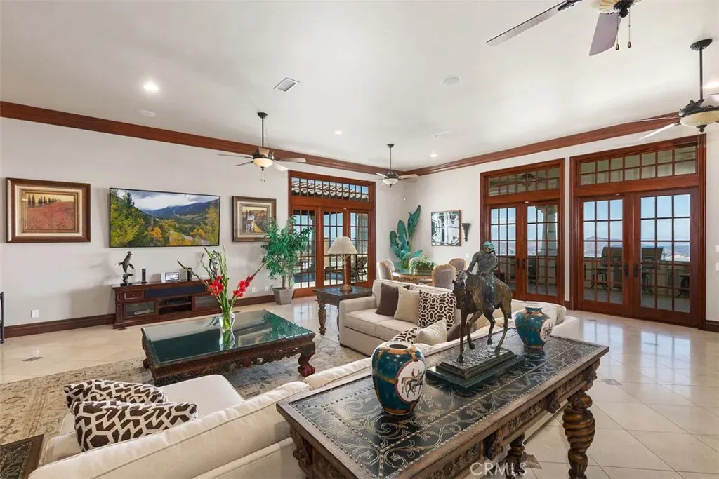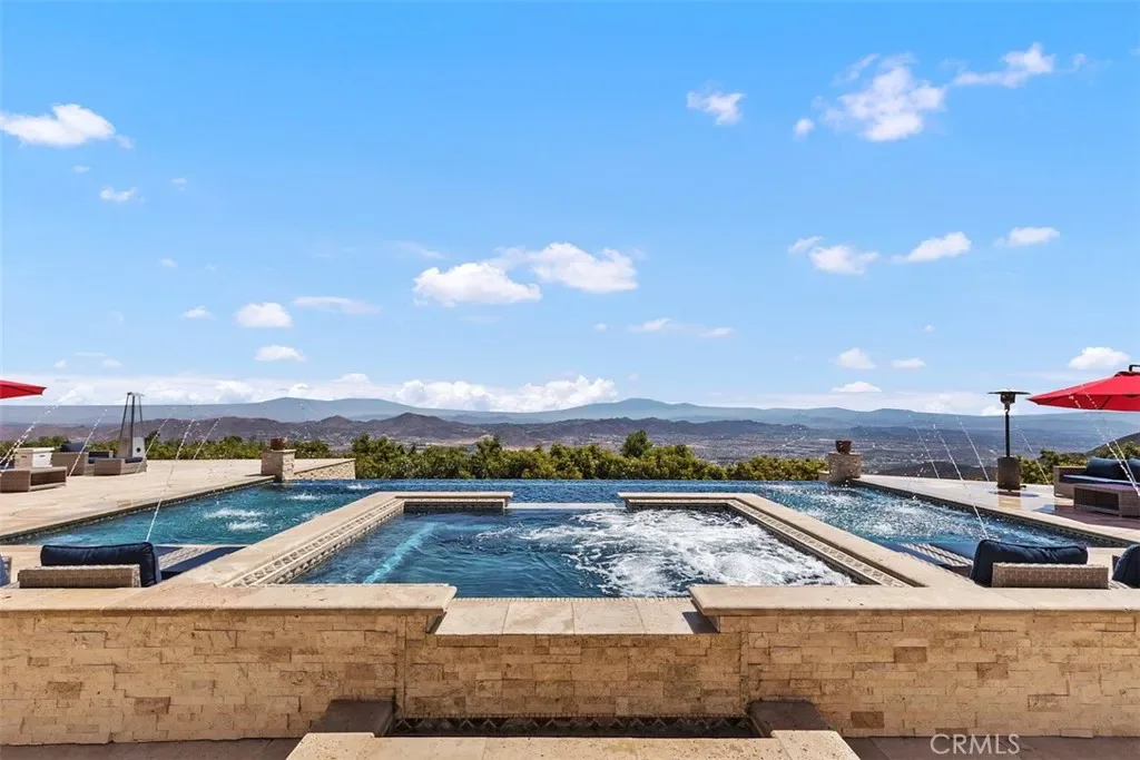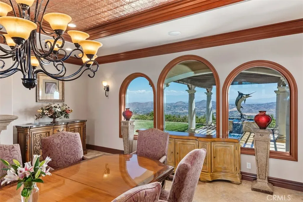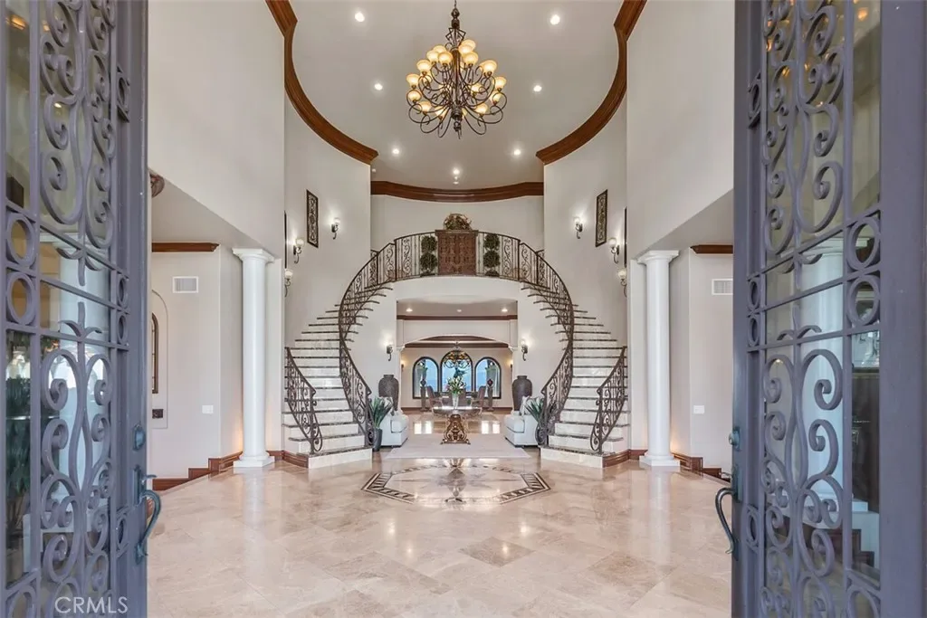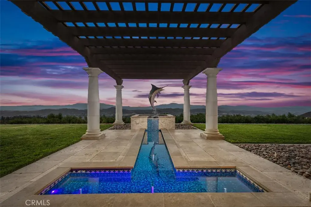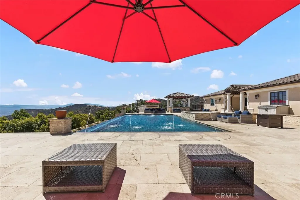 Welcome to Villa Dolce Vista. Commandingly positioned atop 20.39 ACRES at the north point of the EQUESTRIAN COMMUNITY of La Cresta, this Italian inspired masterpiece offers luxury amenities appreciated by the most discerning buyers. Impressive private GATED COMPOUND offers uninterrupted panoramic VIEWS of mountains, city lights, and the Temecula Valley. Encompassing nearly 14,000 SF, the resplendent home includes 5 EN-SUITE BEDROOMS, 8 BATHROOMS, a grand foyer with DUAL STAIRCASES and 24’ ceiling, elegant wood paneled STUDY, FORMAL DINING ROOM with fireplace and expansive city light view. Incredible CHEF’S KITCHEN includes a 20’ granite topped island, COPPER CEILING and LEDGER STONE WALLS. Extraordinary PRIMARY SUITE offers a FIREPLACE, BALCONY with staggering city light views, OPPULANT BATH with dual water closets, vanity areas, marble spa showers, and Jacuzzi tub. Massive GAME ROOM with full wet bar and access to the outdoor travertine deck with FOUNTAINS, INFINITY EDGE JEWEL SCAPE POOL AND SPA and two full outdoor BBQ kitchens. EIGHT CAR GARAGE with built in cabinetry. This SMART HOME is equipped with $155,000 in electronics that provides you with touch screen devices throughout the home. For extended family, a 1,777 SF SINGLE STORY 2 BEDROOM, 2 BATH BUNGALOW with two- 2 car attached garages. Energy efficient with a 47 KW 136 PANEL SOLAR SYSTEM powering both the main home and casita. 53’x40’ RV GARAGE totaling 2,120 SF for storage of two 45’ motorhomes plus all the toys. INCOME PRODUCING HAAS AVOCADO GROVE with automatic fertilization system and WELL watered with two 5000 gallon holding tanks. Additional building pad for future barn, tennis court or helipad. The La Cresta community is located mid-way between Orange County and San Diego County with convenient access to Ontario, San Diego, and John Wayne International Airport. This stunning estate is just minutes from the members only Bear Creek Golf Club offering a Jack Nicklaus designed golf course, tennis, and fine dining as well as the growing Temecula wine country.