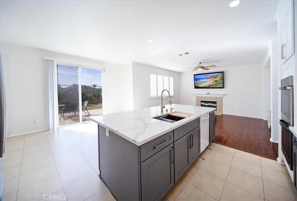 The open-concept kitchen is a chef’s delight, featuring upgraded cabinetry, quartz countertops, and a large center island that flows seamlessly into the family room, complete with a cozy fireplace and custom shutters—an inviting space for both everyday living and entertaining.