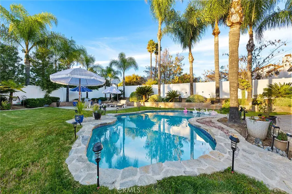 The thoughtfully designed floor plan includes a full bedroom and bathroom downstairs, ideal for guests or multigenerational living. Downstairs also features an office, a wet bar, formal dining room with a fireplace, informal dining area, and a spacious family room with another fireplace, perfect for everyday living and entertaining. The recently remodeled kitchen shines with white quartz countertops, a beautiful stone backsplash, and a new gas cooktop. Upstairs, the primary suite is truly magnificent, featuring a double-door entry, a cozy fireplace, and a luxurious ensuite bathroom with dual-sinks, a vanity, large walk-in closet, sunken soaking tub, and separate walk-in shower. Three additional bedrooms and a full bathroom complete the upper level.Step outside and discover a true backyard paradise. Set on over a quarter-acre of flat, usable land, this outdoor space is designed for entertaining and relaxation. Enjoy warm evenings by the trendy gas fireplace beneath a vaulted wood patio cover, cool off in the pool during summer months, or let kids and pets play freely in the expansive grassy areas. A small basketball court adds fun and functionality, while more than 20 beautifully maintained palm trees line the yard, creating the feel of a private tropical retreat. The grounds are simply beautiful! The home also offers a three-car garage, additional driveway parking, and convenient RV parking. Just a few miles away, Old Town Murrieta offers an abundance of restaurants, nightlife, and entertainment. There is NO HOA and the surrounding schools are award winning! This property doesn’t just check boxes—it feels good. It feels like home.