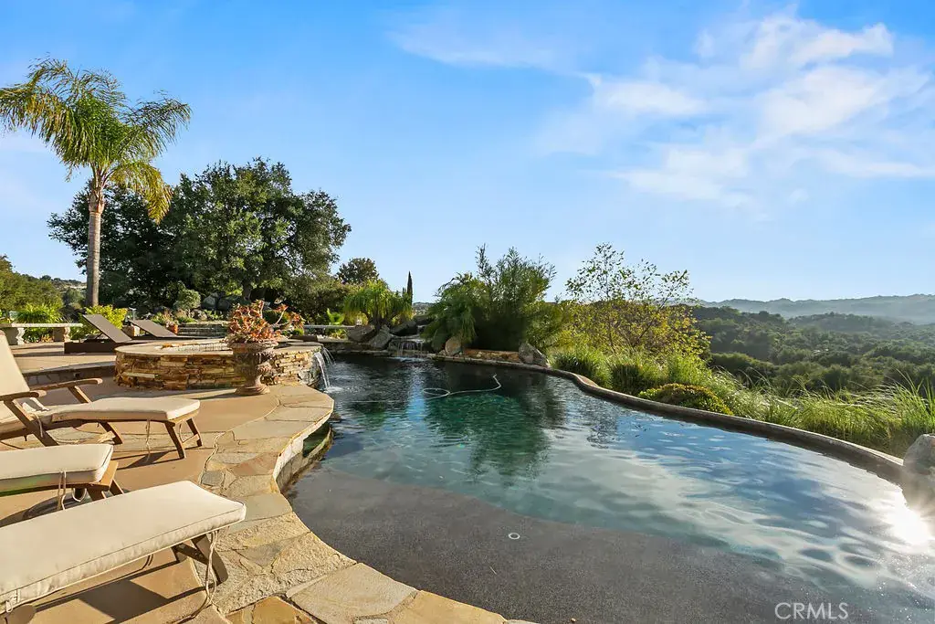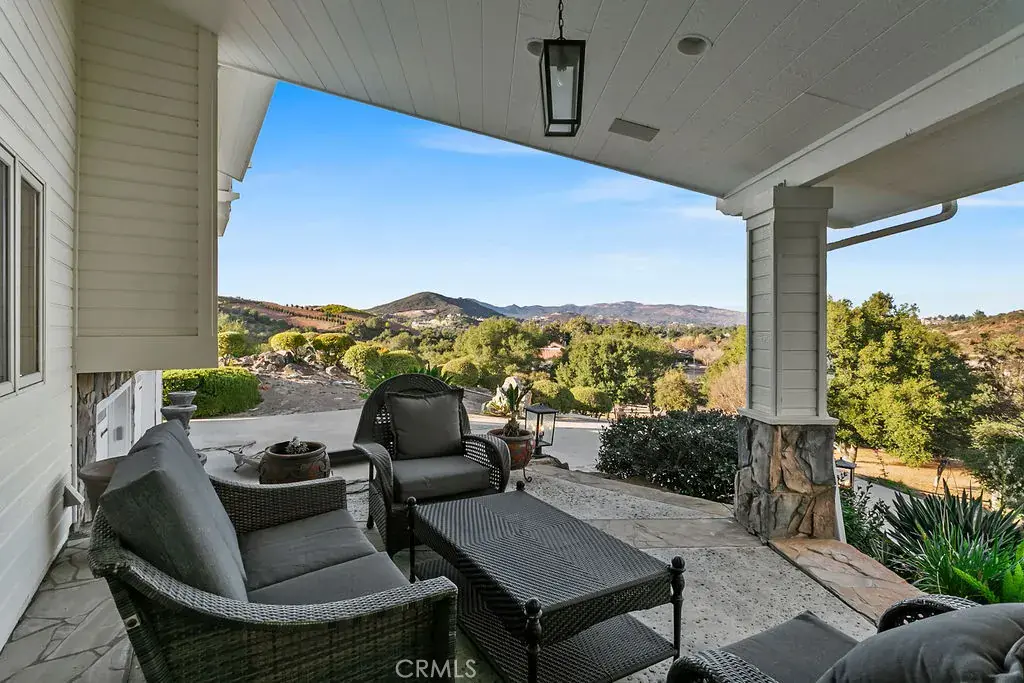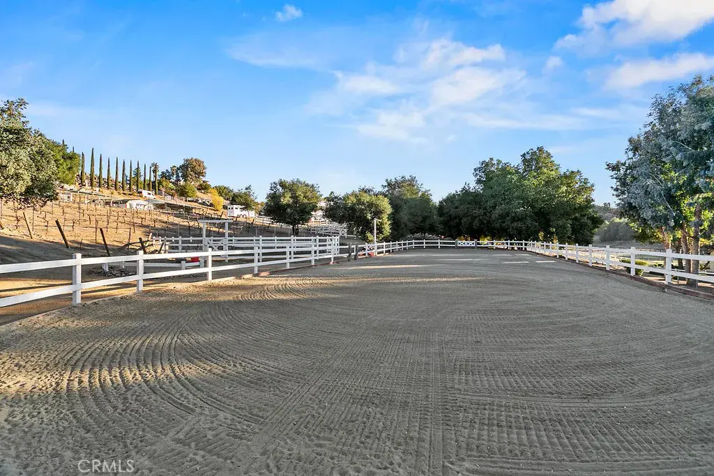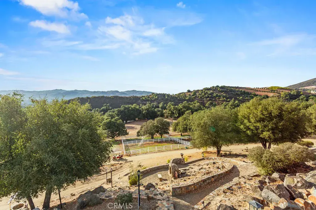 Stunning one of a kind equestrians dream “ view” estate. just over an hour to Orange County and North San Diego. Enter through impressive gated entry up long private driveway. The estate is set up for the professional trainer or personal equine client . Two arenas, one GGT footing, the 2nd arena sand. Round pen, 8 turn outs, 6 with natural oak tree shade, waterers, some grass, white vinyl fencing. Centre Aisle 6 stall barn,auto waterers, fly system, cameras, rubber matting, lookouts, additional 3 stalls, grooming/bathing area. Tack shed and more. The estate has its own shaded riding trail and also access to many miles of riding trails within the area. Small Cabernet Sauvignon vineyard, corn hole and Bocci Ball court ,adjoining gazebo viewing area. Multiple sitting, viewing areas. Expansive Chicken “house”, Italian garden, Zen/prayer area. Many established oaks drape the property with shade and beauty. Three apartment/studios in the barn, parking for multiple vehicles, two automatic security gates.Shade trees, fruit trees and several entryways. Basically Single Story sprawling residence is recently updated with amazing gourmet kitchen with huge center island,2 dishwashers. gas stove, double ovens built in refrigerator and large pantry, opens to grand great room with seoaring ceilings, hand crafted beams, and crackling fireplace, French doors, views from every window. Primary bedroom, 2 walk in closets, fireplace, soaring ceilings and sitting area. Primary bath is stunning , 2 auto toilets, fireplace, romantic tub, grand shower area. Formal dining area has a wall of cabinets and storage with French doors to large patios, formal living area could be a game room or huge office with a wall of bookcases and storage, a bar area and more. Unique Théâtre room has professional seating for 7/8 people. Spacious Secondary bedrooms One with en suite bath and access to the idyllic Koi pond and fountain area. Just one upper viewing room/office/library. Stunning entertainment area with expansive deck, fire pit, fire lights, sparkling spa, infinity pool has waterfall, swim up bar. State of the art outdoor kitchen with t.v. large counters, sit up bars, heater and stainless appliances., BBQ, refrigeration drawers, hot plates/storage area. Outdoor shower, Well ,Koi pond, second fire pit. Spacious three car garage, epoxy,flooring, huge attached storage room, large motor court, drive through road to barn. Several access roads, gates throughout property.