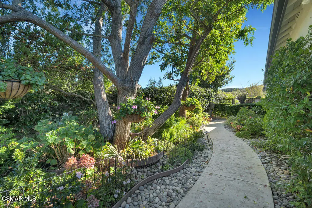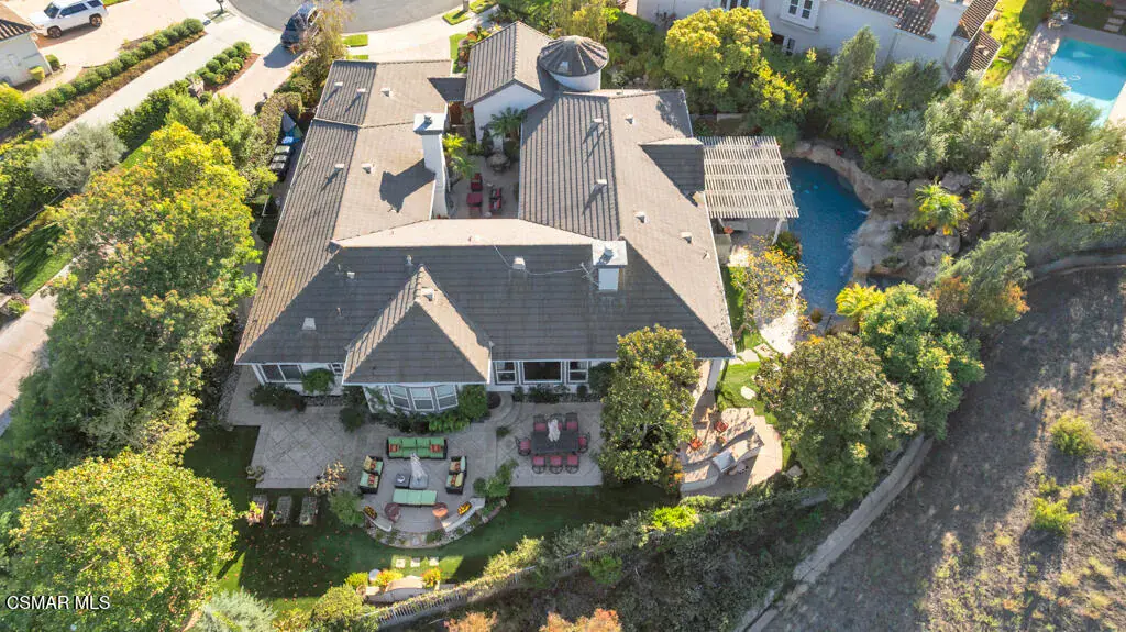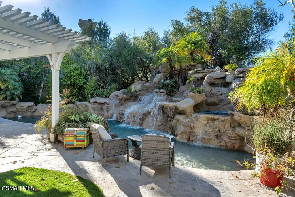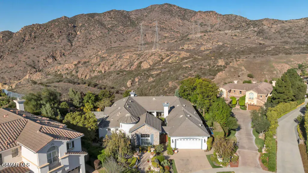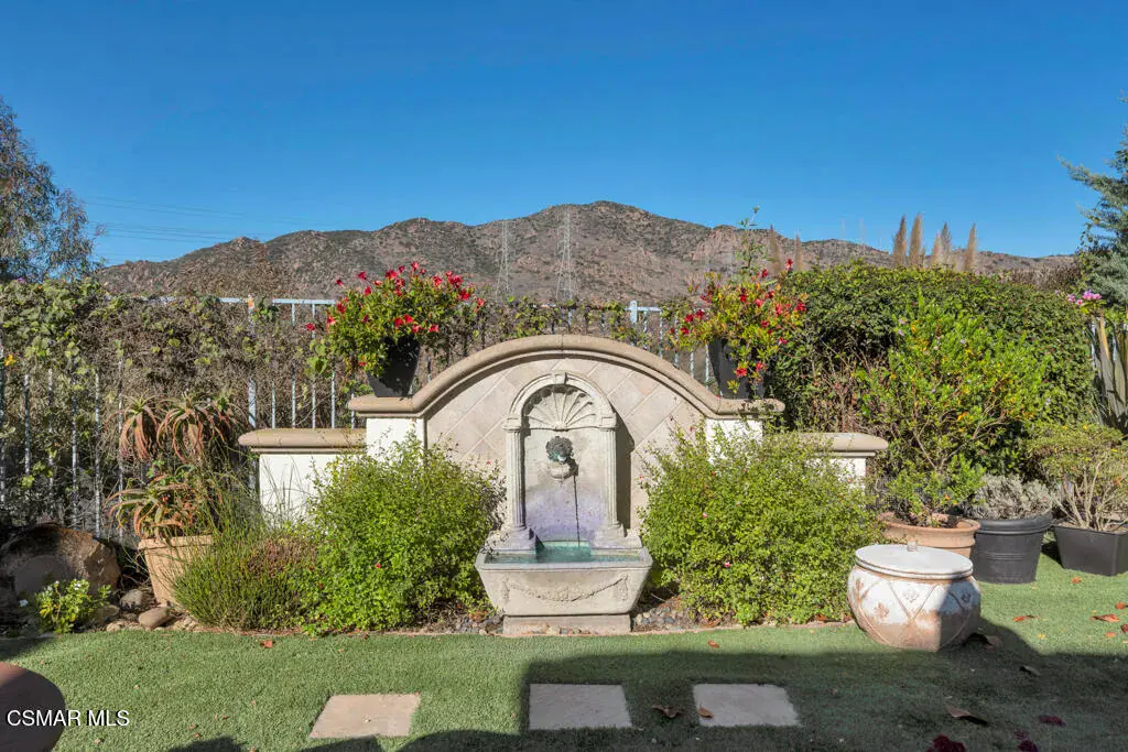 Welcome to 103 Via Sandra, a beautifully upgraded 4-bedroom + Office, 4-bathroom single-story Mediterranean-style home located in a private gated cul-de-sac in the sought-after Dos Vientos community of Newbury Park. This approximately 3,400 sq ft residence showcases stunning mountain views, soaring ceilings, LED lighting throughout, a Sonos sound system, and a flexible open layout designed for modern comfort. The chef’s kitchen features top-of-the-line Wolf appliances, granite countertops, a center island, and custom cabinetry. A luxurious primary suite includes enough space for a sitting area, spa-inspired bath, and spacious walk-in closet. Additional highlights include a center courtyard with a fireplace, prestigious home office, a spacious laundry room, 2-car tandem garage, and exterior security camera system. The private backyard is perfect for entertaining with turf landscaping in the front and backyard, a covered patio, built-in BBQ, and stunning pool and spa with newly resurfaced rock waterfall and slide. A whole-home Generac generator adds reliable backup power, while the location offers convenient access to top-rated schools, scenic trails, parks, and amenities.