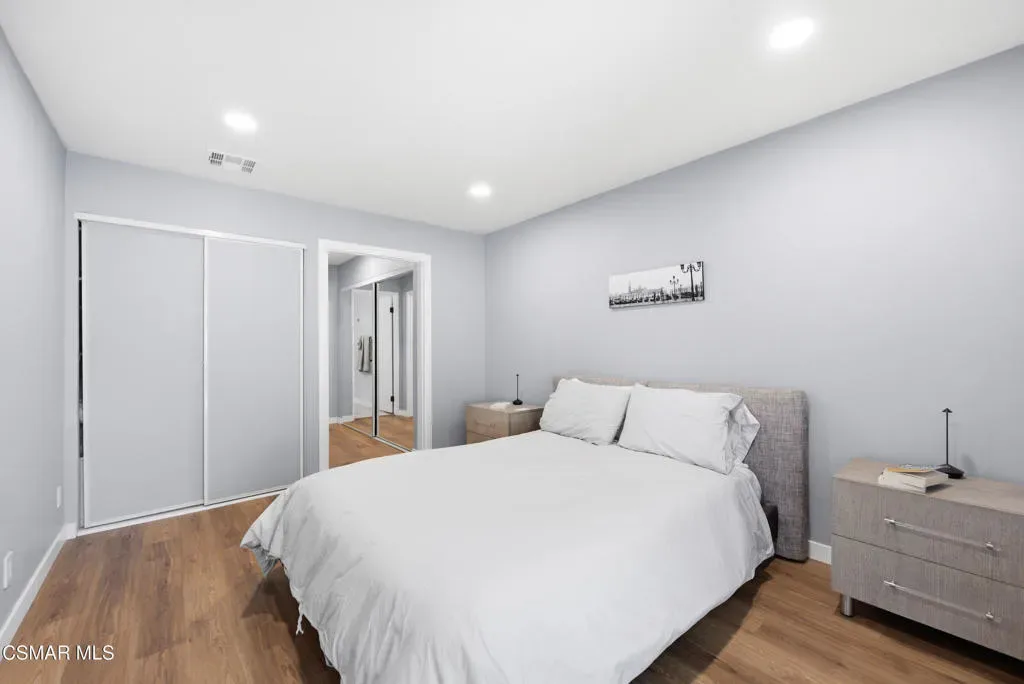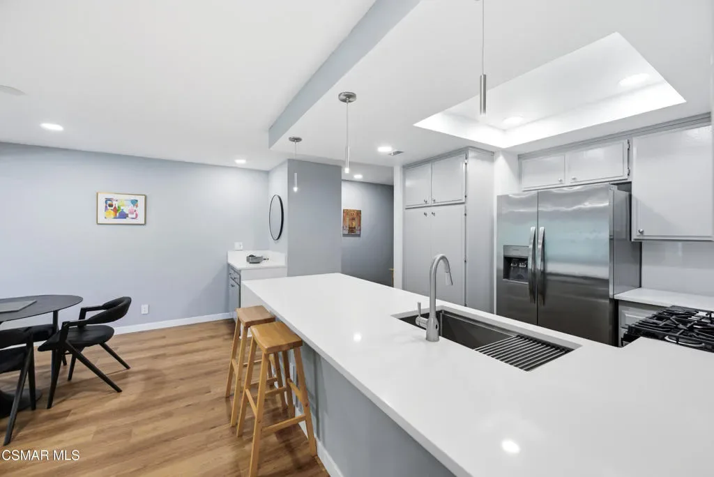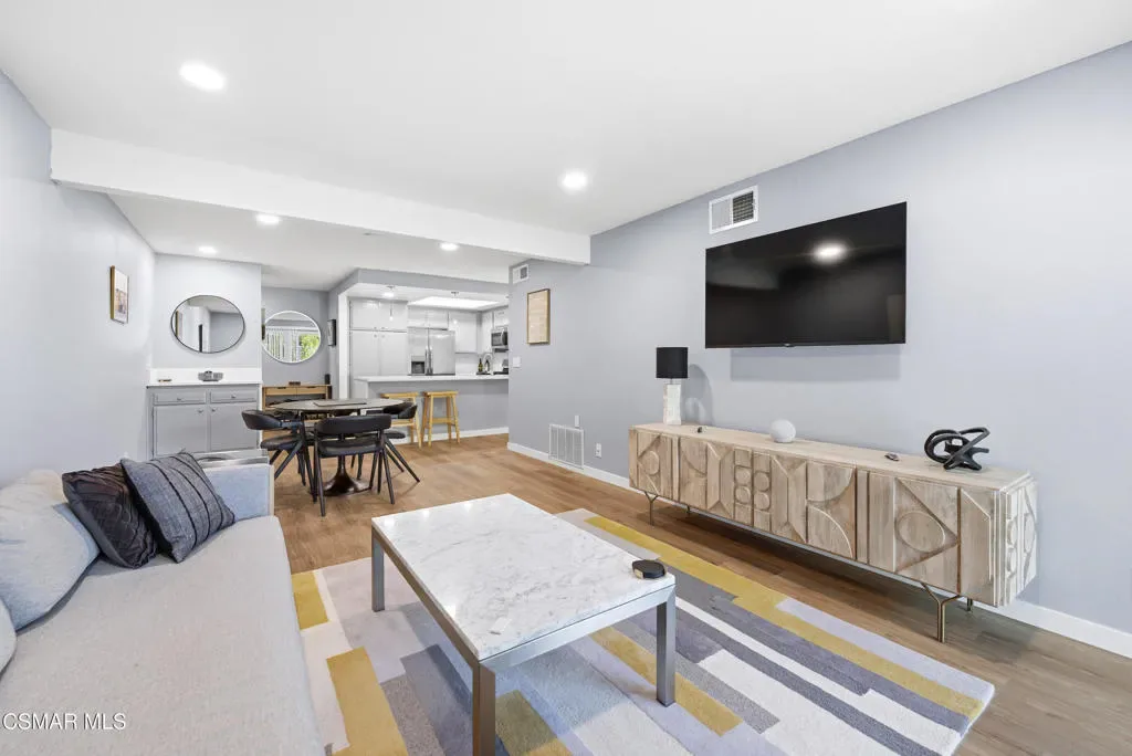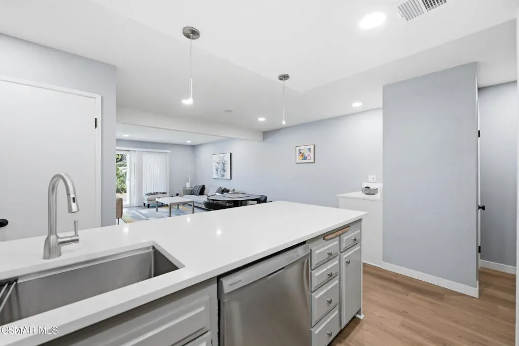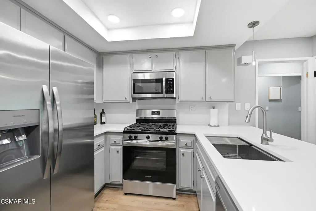 Newly remodeled first floor condo in coveted Amberwood complex. This turnkey home has been updated throughout, with newer faux wood flooring, fresh paint, a gleaming kitchen with quartz countertops and stainless aplliances, new bathroom fixtues, newer sliding doors, and new lanscaping in the generous back patio. The home also comes with central AC, overhead recessed lighting, an attached single car garage, and an additional parking space. The well-maintained complex includes two community pools/spas and ample guest parking, Close to shopping, dining, freeway, Amgen, and highly rated schools.