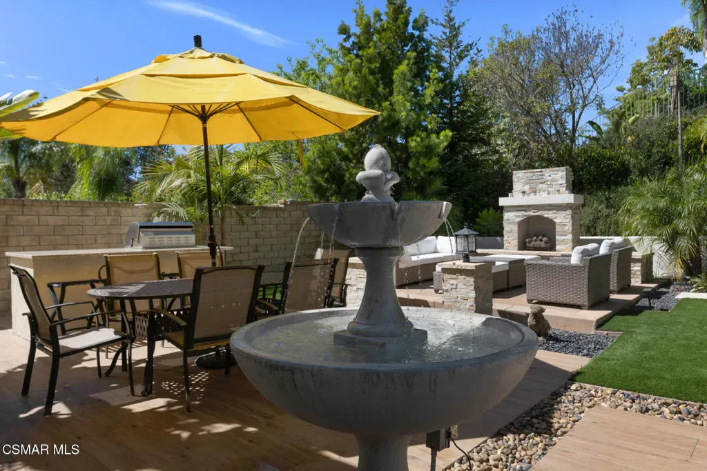 Gorgeous Light & BRIGHT Dos Vientos Pool Home in Villa Serrano! Set on an expansive ~1/4 acre lot, this beautifully upgraded residence showcases STELLAR curb appeal with its modern-Tuscan architecture, LUSH grass lawns, tropical landscaping with swaying palm trees, manicured grounds, and a welcoming front porch that sets the tone for the GRAND interior. Step inside to a SPACIOUS open floorplan highlighted by TALL ceilings and an ABUNDANCE of natural light, complemented by high-quality wood flooring flowing throughout. The Living Room is filled with sunlight from TALL windows with plantation shutters, while the adjacent Office–complete with mullioned French doors, built-ins, and sidelights–offers flexibility as a potential 5th bedroom, giving the option for TWO bedrooms downstairs. The Formal Dining Room is ideally positioned between the Living Room and Kitchen, providing an elegant space for gatherings. The Family Room is SUPER BRIGHT and generously sized, featuring built-in ceiling speakers and a CHIC resurfaced gas fireplace with bench-style hearth, all overlooking the beautifully designed backyard. The GOURMET Kitchen is a chef’s DELIGHT, showcasing soft-close shaker cabinetry, mosaic tile backsplashes, granite countertops, and a LARGE redone center island with breakfast bar seating, 5-burner gas cooktop, and mosaic-tile surface. High-end stainless-steel appliances include a Thermador convection double oven, and the adjoining breakfast area enjoys backyard views with direct access outside. A downstairs bedroom with WALK-IN closet and direct access to a full bath provides ideal guest or multi-generational living. The Laundry Room offers TONS of storage, tile countertops, wash basin, and direct access to the finished 3-car garage (including tandem bay) featuring EPOXY flooring, ceiling storage racks, and EV charger readiness. Upstairs, the Primary Suite (~800 sq ft) is a PRIVATE retreat with double-door entry, separate sitting area, BRAND-NEW plush carpet, and an en-suite bath which has been beautifully redone with NEW tile flooring, dual vanities + private makeup station, a grand soaking tub, STUNNING frameless glass shower with bench, and TWO closets including a large custom-organized walk-in. An additional room off the bath offers ideal use as a nursery, gym, or second walk-in closet! Secondary bedrooms are WELL-SIZED, each with ample storage, and two feature en-suite bathrooms. A HUGE upstairs Bonus Room offers incredible flexibility for a media room, playroom, gym, office, or additional bedroom–with easy potential for Jack & Jill bath access. The backyard–fully REVAMPED in ~2020–is an entertainer’s PARADISE featuring a pebble-surfaced geometric pool & spa, stone decking, wood-like patio flooring, sprawling artificial grass lawns, a STUNNING stacked-stone outdoor fireplace, and a granite-topped built-in BBQ with Delta Heat grill and gas line. A wide side yard with mature avocado tree adds even more usable outdoor space. Additional highlights include DUAL HVAC with NEWER A/C units (2021), NEWER water heater (2021), newer pool pebble finish, and BRAND-NEW carpet. Located within WALKABILITY to Sycamore Canyon School (K-8) + Del Prado Playfield and nestled in the pristine & highly desirable Dos Vientos community with access to TOP-rated schools, scenic parks, and miles of hiking and biking trails–this is an exceptional opportunity to enjoy one of the Ventura County’s most sought-after neighborhoods.