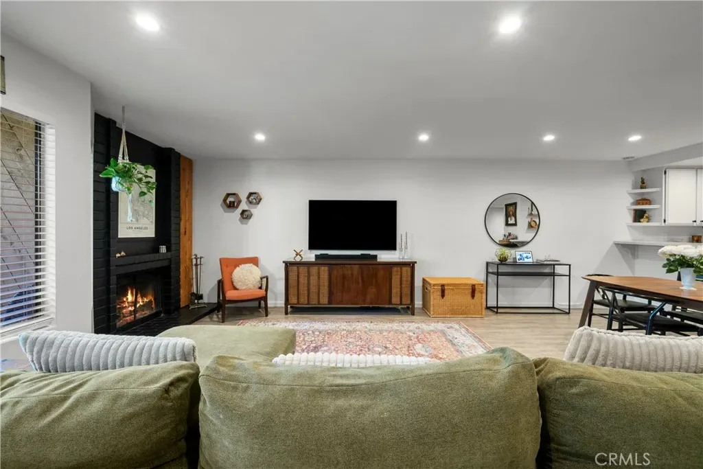 Walkable condo located in a gated community off Apple St and Lyons Ave with easy access to both the 5 and 14 freeways. The condo features an open main living area with a brick fireplace, new recessed lighting, and a sliding glass door that leads to a private balcony with peaceful greenery views.
