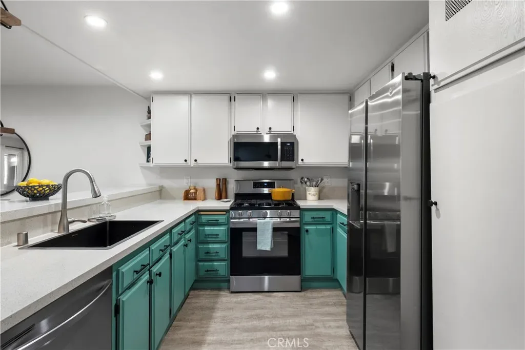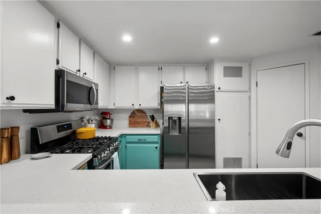 The kitchen features quartz countertops, a large sink, and plenty of cabinet space and opens to the living area, making the space feel open and comfortable for everyday living or entertaining.