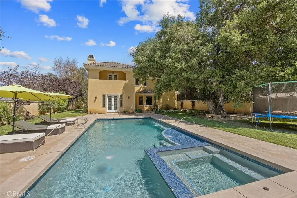 Stunning Custom Estate in Placerita Canyon Swimming Pool, Spa, 3 car garage plus 2 car detached garage (potential ADU or Pool home) and RV Parking with access road!! 5 luxurious bedrooms, 4 full bathrooms and 2 convenient powder bathrooms and bursting with top notch designer finishes! This regal custom estate is nestled in the highly desirable Placerita Canyon community adjacent to Masters College, open space preserve hiking and equestrian trails! The elegant entry is unforgettable with iron adorned glass door, winding staircase, and unforgettable stone tourette which opens first to the stunning home office complete with 2 story ceilings and overlooks the gas fireplace and treelike neighborhood! MAIN FLOOR FULL BEDROOM AND BATHROOM, incredibly thoughtful design and luxurious finishes! At the heart of the home, the chef’s kitchen boasts extra thick beveled granite countertops, stainless steel appliances—including cooktop, ovens, and dishwasher, Jenn-Air Subzero refrigerator/freezer! Complete with glass accented see through cabinetry, butler’s pantry, wet bar, walk in pantry, designer lighting, reverse osmosis filtered water, pot filler at the range and pool views… The kitchen seamlessly opens to the living area, creating a perfect space for large gatherings and cozy, everyday living! Upstairs, you will find tines hardwood flooring across the loft and hallways leading to spacious secondary bedrooms with a Jack-and-Jill bathroom plus a convenient half hall bath and home gym/ 4th upstairs bedroom! The grand primary suite emanates a resort style vibe featuring private balcony overlooking the serene oak trees, pool and hillside views! Enormous walk in closet with built in organizers, separate tub and walk in shower make this a place you’ll never want to leave! Outside you will find the sparkling pool (built in 2014) and ample space for relaxing and entertaining! The second detached garage (in addition to the attached 3 car garage) offers additional storage and the potential for a pool house or ADU and connected to an RV access road to park your toys and truck to of sign from the main residence! This remarkable estate perfectly blends sophistication, comfort, and opportunity—all within one of Placerita Canyon’s most sought-after locations with no required HOA and no Mello Roos! Plus a private gated access road to reach the 14 FWY for homeowners use only! This is a lifestyle opportunity you will cherish for years to come!