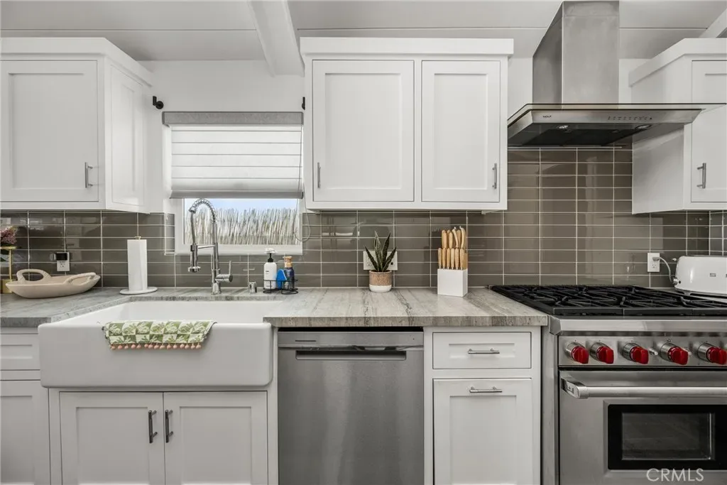 The extended front porch captures views of the bay and refreshing ocean breezes, creating the perfect setting to relax or entertain. Glass front doors open to a welcoming living room with vaulted ceilings, a cozy fireplace, and beautiful whitewashed flooring throughout. The chef’s kitchen features polished limestone waterfall-edge countertops, generous storage, and high-end appliances including a Wolf range and Sub-Zero refrigerator. Just off the kitchen is a convenient laundry and butler’s pantry area.