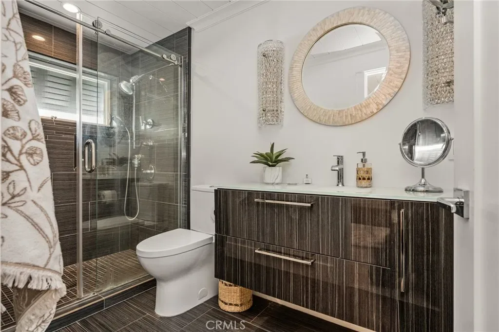 The private backyard is ideal for entertaining, featuring a newer spa, built-in barbecue, outdoor refrigerator, and a fully enclosed outdoor shower. Additional highlights include a remote-controlled awning and retractable gate.