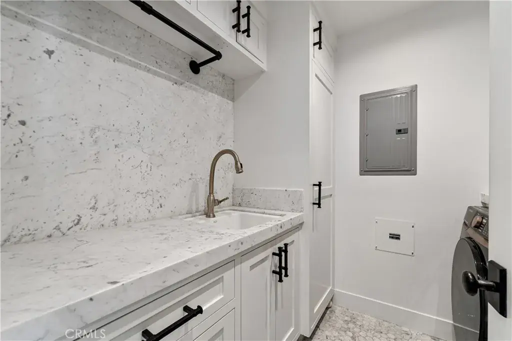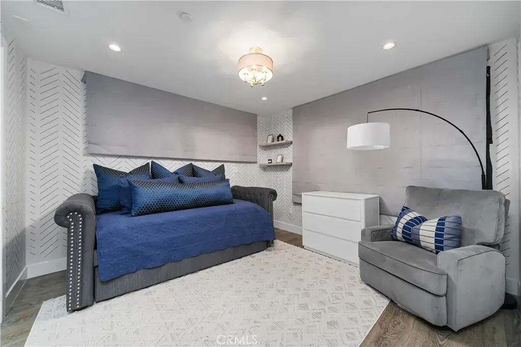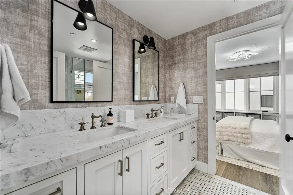 Upstairs, all four bedrooms are thoughtfully placed to maximize comfort and functionality. Two guest rooms share a stylish Jack and Jill bathroom, while the third guest room features its own en-suite bath with a tub and shower combo. A built-in desk in the hallway utilizes every inch of space efficiently, and a full laundry room with a sink and ample cabinetry adds convenience. The primary suite is a luxurious retreat. It includes a custom walk-in closet complete with shoe storage, jewelry drawers, and ample room for clothing and accessories. The bedroom opens to a private patio furnished with a seating area and fire pit, creating the perfect spot to unwind. The spacious master bathroom features dual sinks and an oversized walk-in shower.
