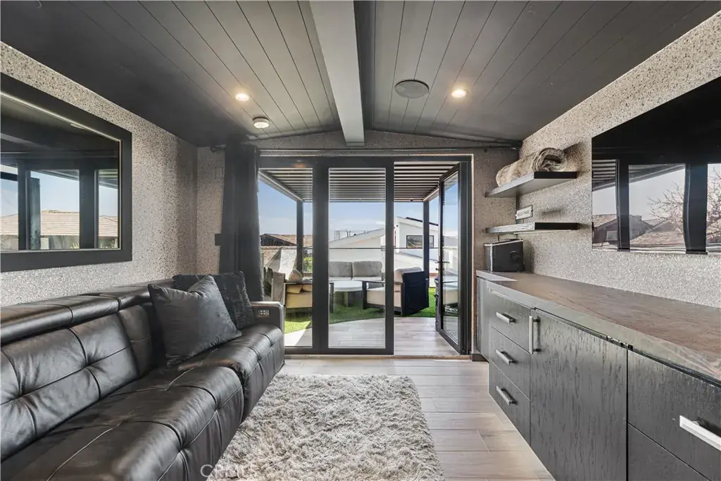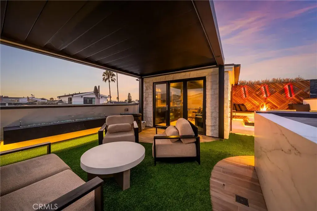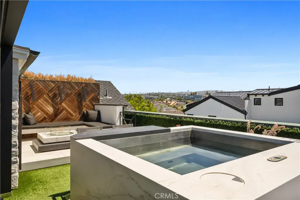 Crowning the home is the spectacular rooftop deck, designed for both relaxation and entertainment. Enjoy ocean views from the hot tub or relax in one of the two separate seating areas, one that has a fire pit. An enclosed rooftop studio enhances the space with a TV, fridge, microwave, and a reclining couch—creating a cozy, all-season retreat.