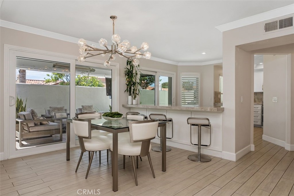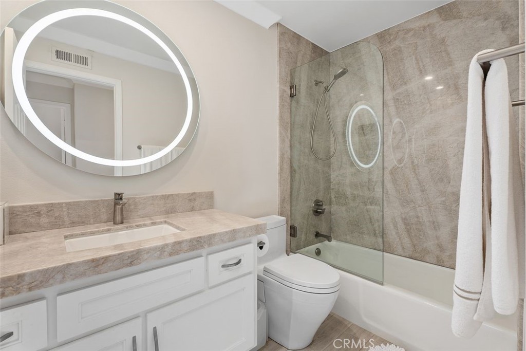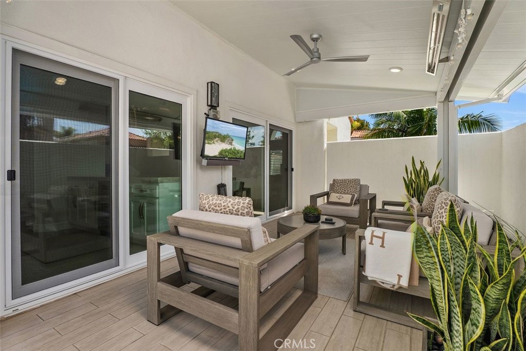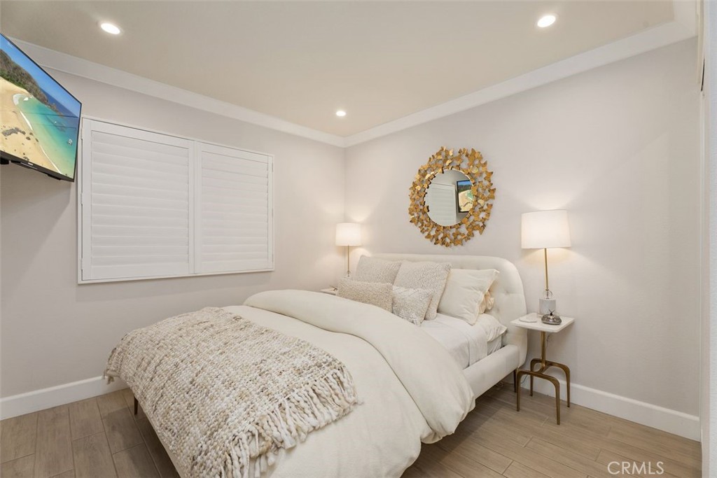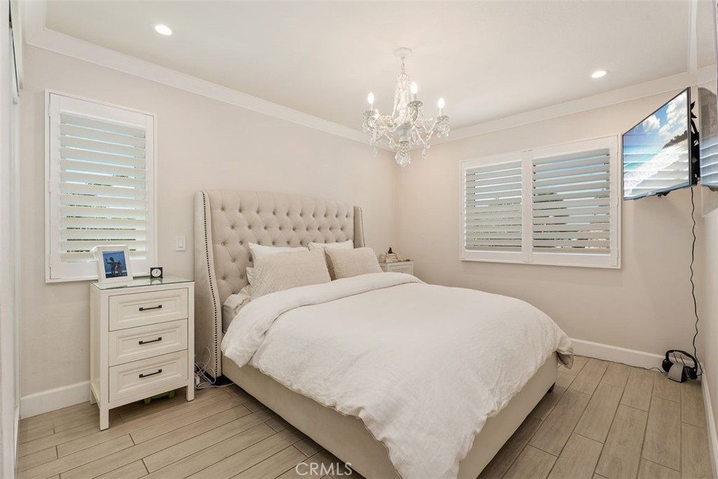 Secondary bedrooms include new windows, wood shutters, mirrored closet doors, and porcelain tile flooring. One bedroom has a chandelier and custom closet drawer setup; the other offers updated finishes and natural light. Additional features include hidden under-stair storage, internet readiness, newer water heater, custom landscaping, and an outdoor area with porcelain hardscaping that matches the interior and an outdoor TV. The two-car garage features epoxy floors, cabinets, and a new garage door opener. Community amenities include a pool, spa, and tennis courts. The home is located near Fashion Island, beaches, scenic trails, and top-rated schools.