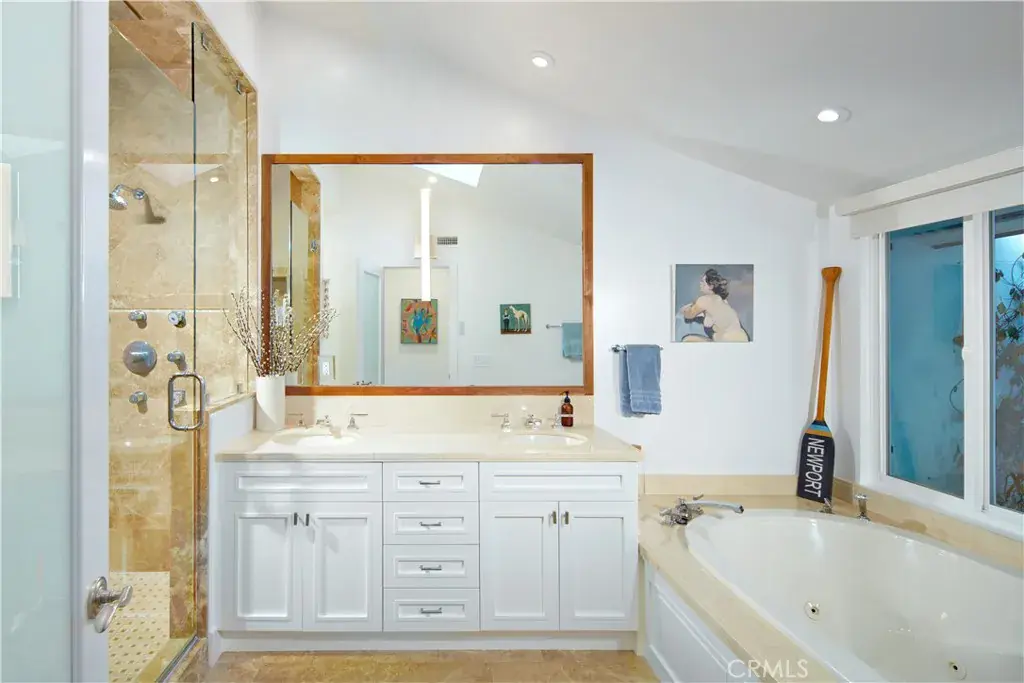 A tranquil primary suite—complete with a fireplace, dual vanities, walk-in shower, and stone-wrapped soaking tub—occupies the main level along with a private office, two additional ensuite bedrooms, powder room, and laundry room. Upstairs, the second primary suite presents a Japanese soaking tub, separate shower, dual walk-in closets, and private balcony that floats above the fairway. Completing the home is a four-car garage with Tesla charger. Additional highlights include 41 seller-owned solar panels, two newer tankless water heater, metal roof with warranty, newer electrical and plumbing, low-energy lighting, a whole-house fan, and a Lifesource water treatment system. The home is equipped with a SimpliSafe security system with wired exterior cameras and comprehensive sensors, plus integrated Lutron lighting and Sonos connectivity for remote access, programmable control, and peace of mind. Just moments from Fashion Island, Newport Harbor, world-class beaches, and top-tier schools.