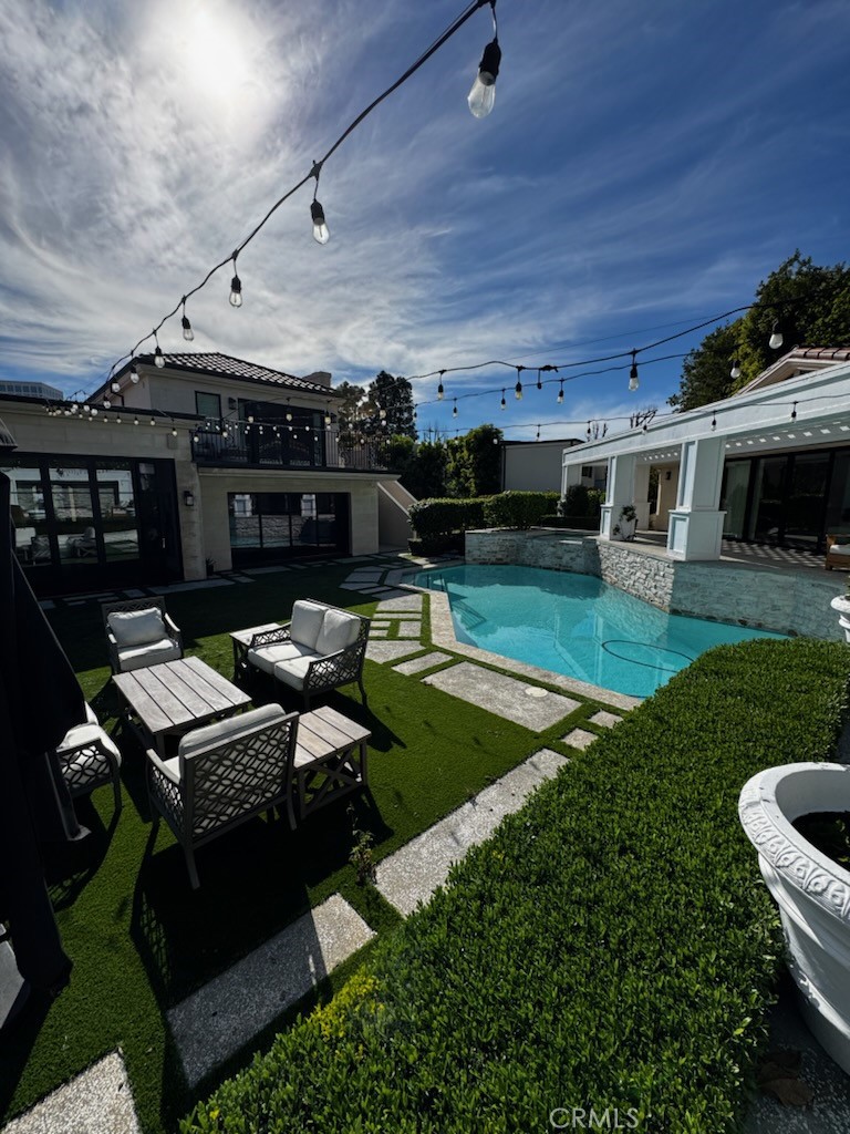 The resort-style grounds include a pool and spa, firepit lounge, stacked stone water feature, built-in BBQ kitchen, multiple outdoor entertaining areas, and a covered loggia with fireplace and TV. The detached casita provides private accommodations with a kitchen, full bath, and laundry. The property is near Fashion Island, Newport Beach Country Club, Balboa Island, beaches, and Orange County dining and shopping.