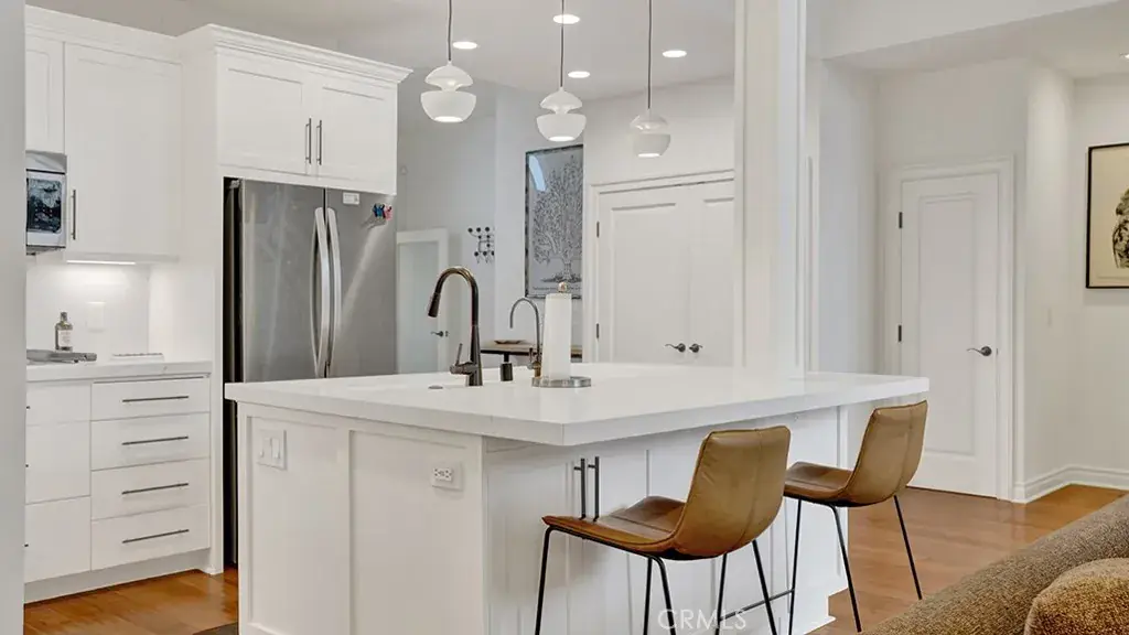 The updated kitchen offers white shaker cabinetry, quartz countertops, stainless steel appliances, and a spacious center island with bar seating, ideal for entertaining. The dining area opens to private outdoor spaces, creating a seamless indoor-to-outdoor flow.