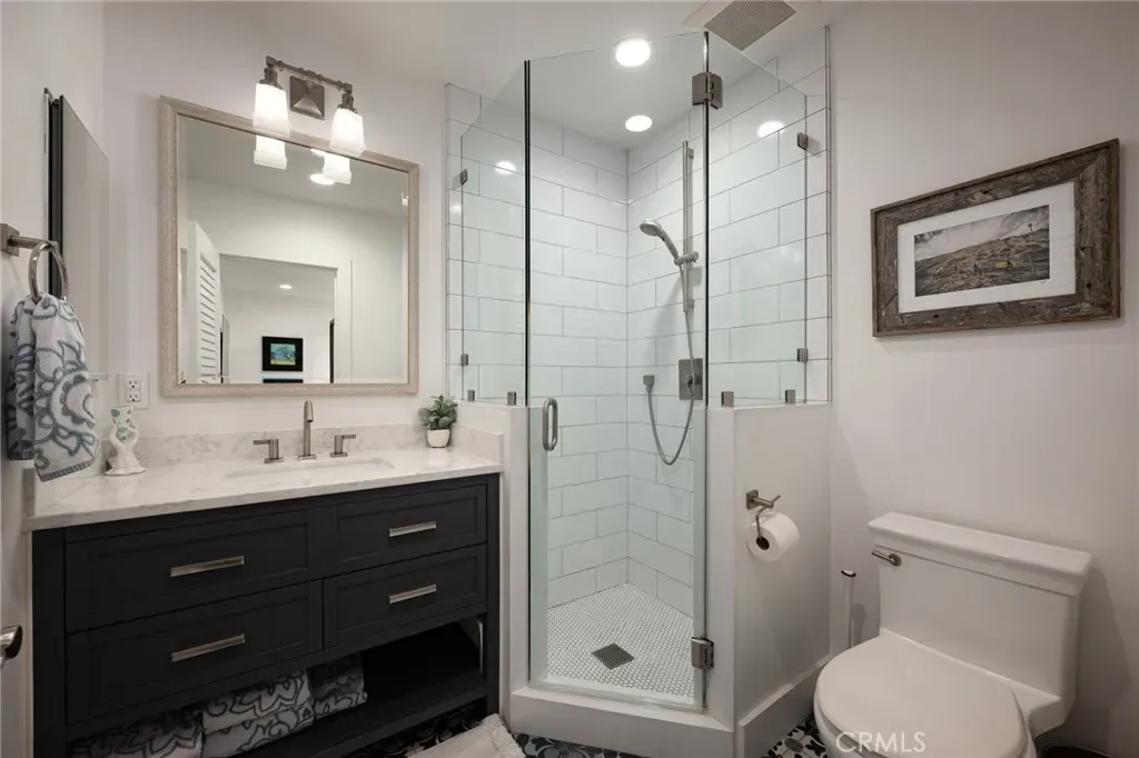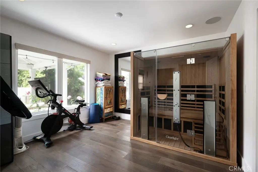 Outdoors, the resort-style backyard invites both relaxation and recreation, complete with a pool, cold plunge, and infrared sauna—surrounded by lush landscaping and coastal breezes.
