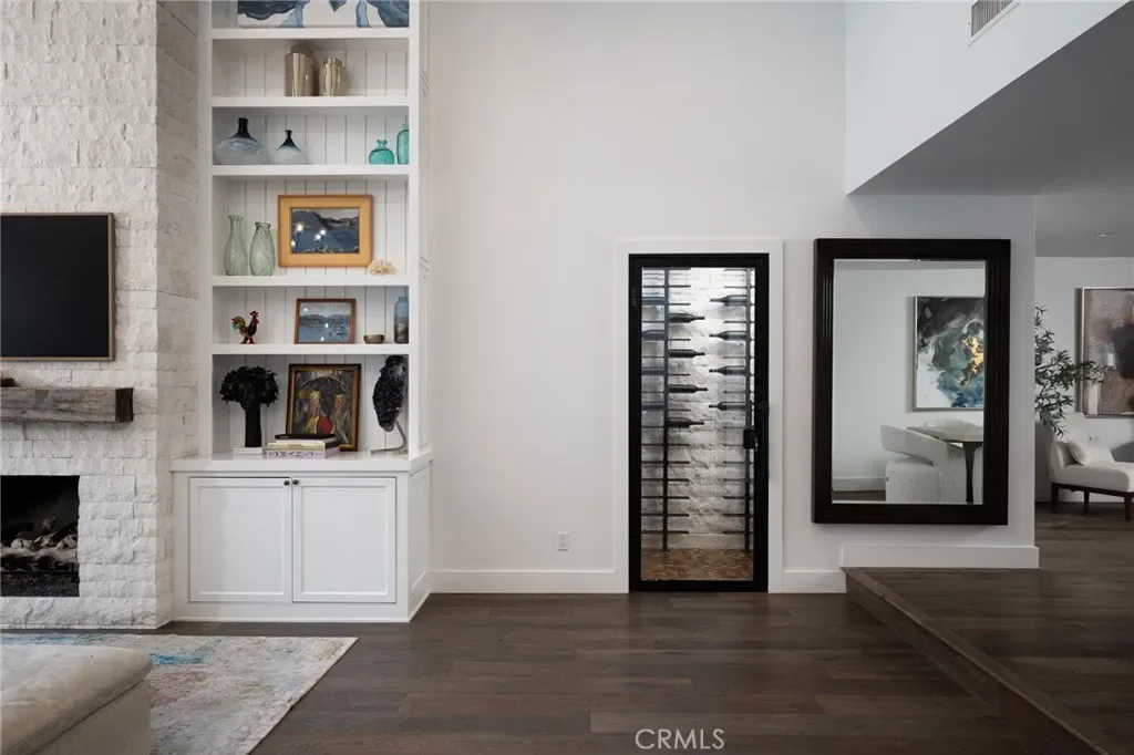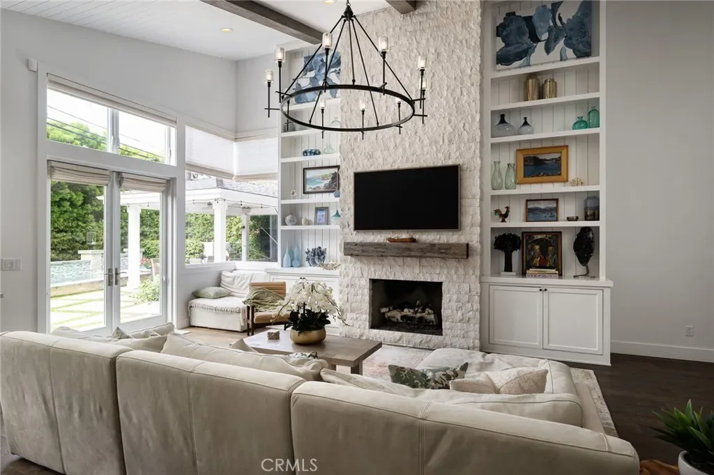 Designed with both scale and intention, the interiors are anchored by a bespoke chef’s kitchen featuring a statement island and premium finishes, seamlessly connecting to light-filled living spaces. A striking floor-to-ceiling stone fireplace defines the main living area, creating a warm yet sophisticated focal point.