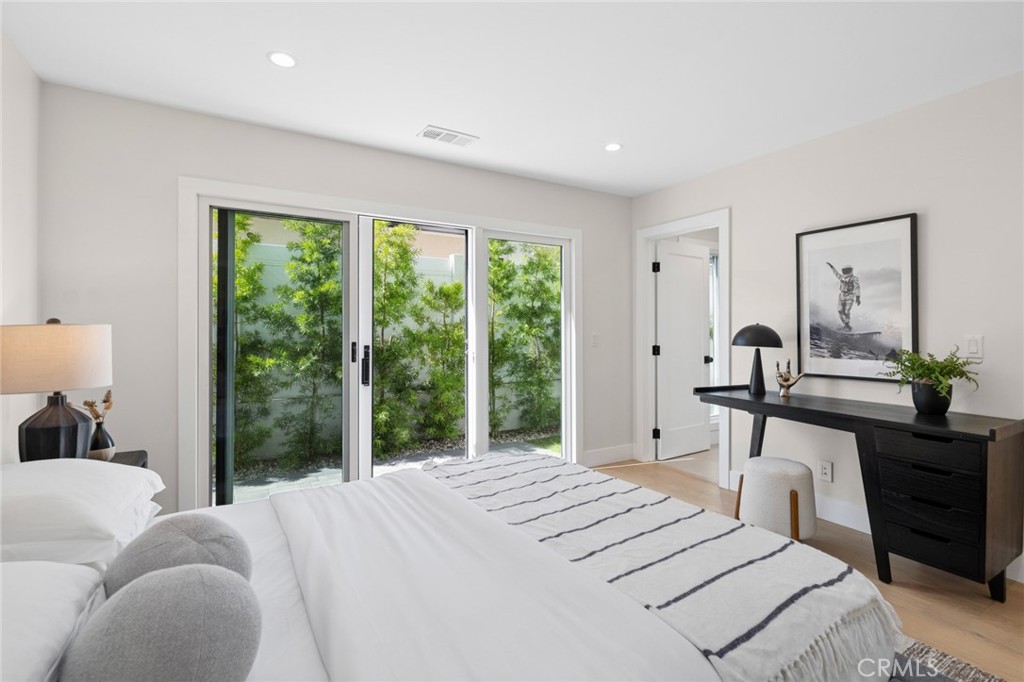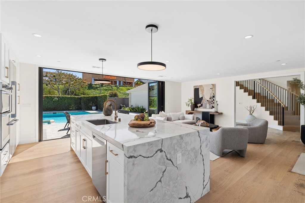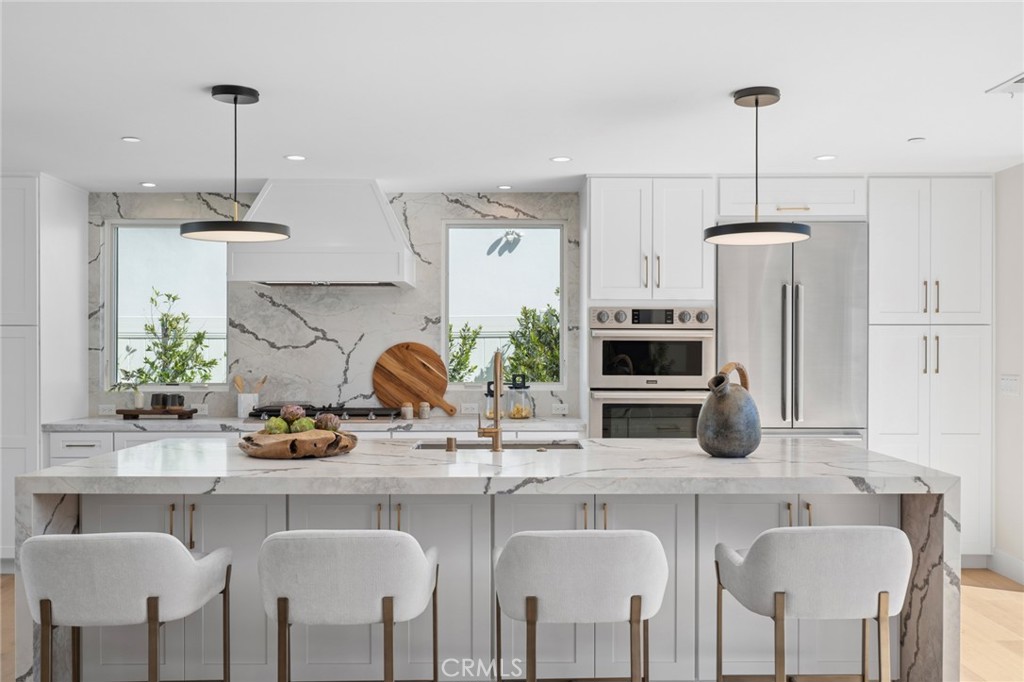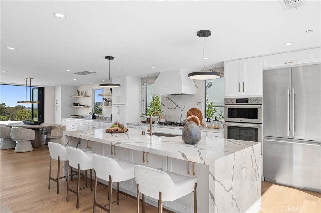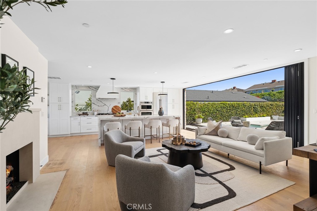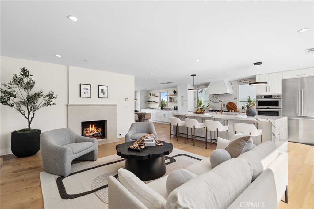 At the heart of the home, the designer kitchen is a true showpiece, highlighted by a stunning quartz waterfall island, all-new custom cabinetry, premium DACOR appliances, and curated designer lighting. Rich wood flooring flows throughout, enhancing the home’s warm yet contemporary aesthetic.