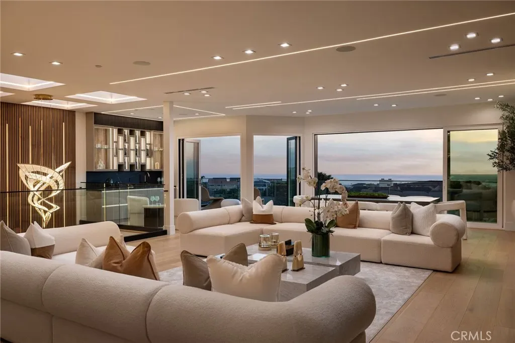 An extraordinary vantage point of ocean, harbor, island, and city lights defines this exceptional coastal estate—where sweeping panoramas of the Pacific, Catalina Island, Newport Harbor, and the Los Angeles skyline become a daily backdrop. Set within the guard-gated community of Harbor Ridge, this newly transformed residence rests at the end of a quiet cul-de-sac, offering a rare sense of seclusion paired with architectural sophistication.