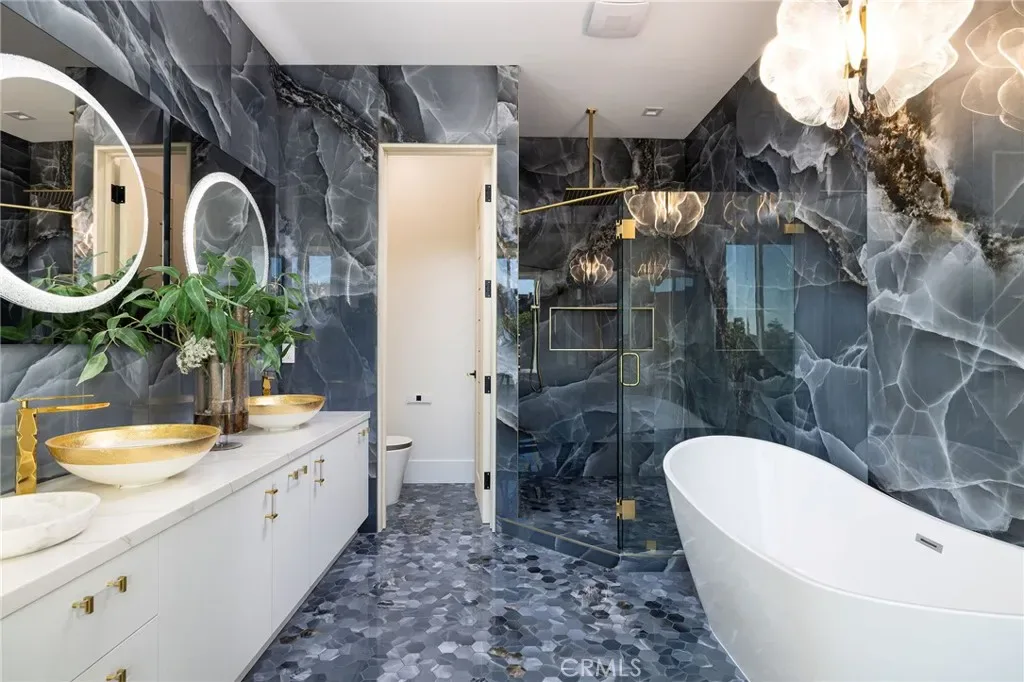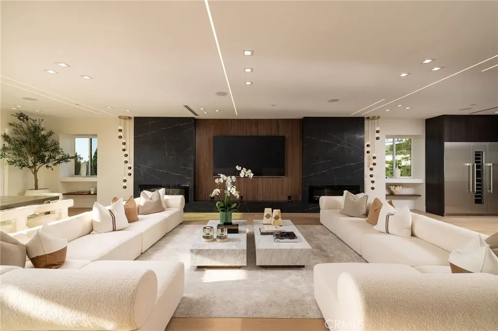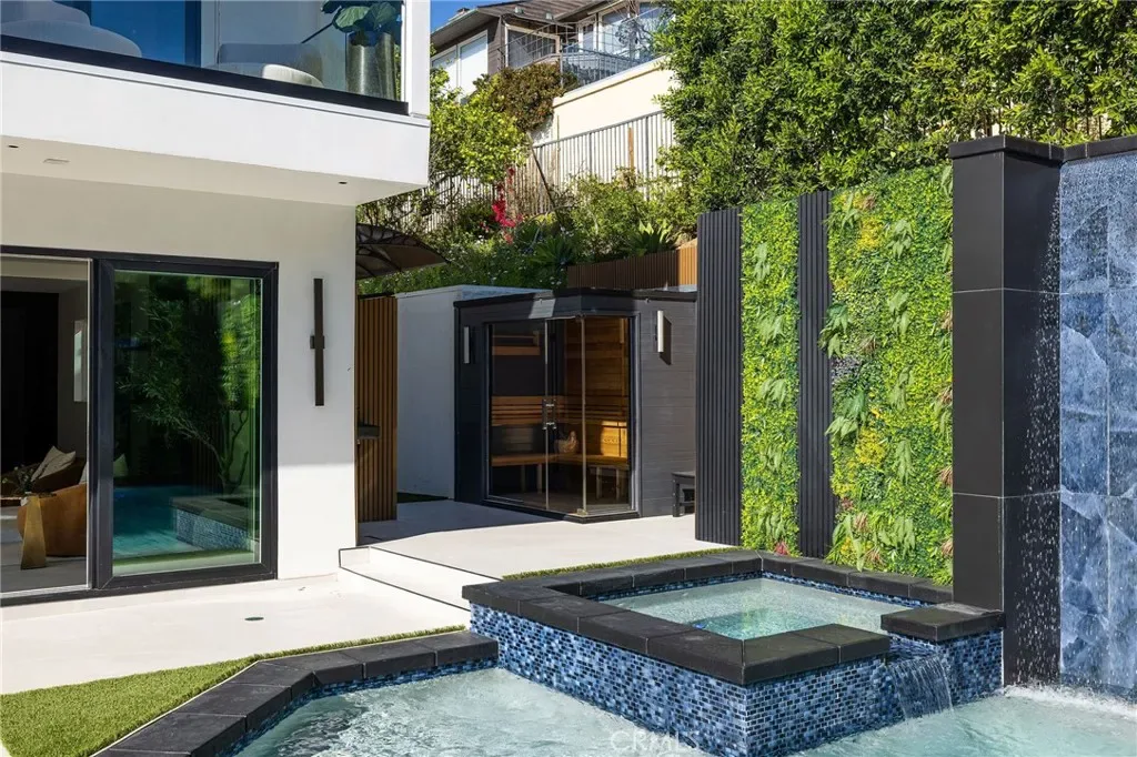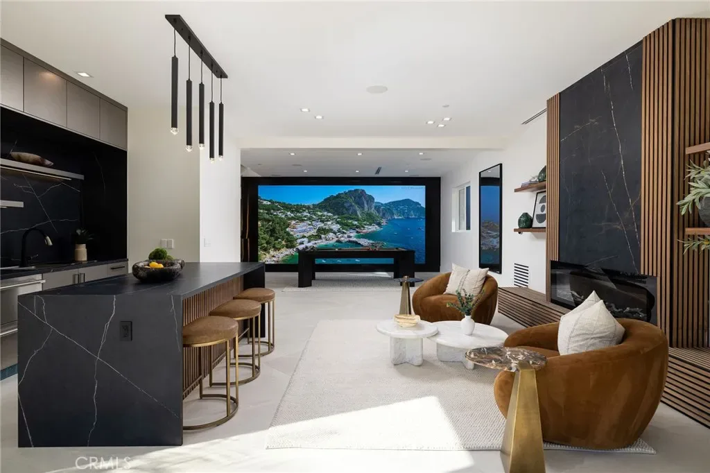 A private entry gate and statement front door introduce interiors that are both striking and inviting, where clean-lined design meets warmth and livability. A private interior elevator provides effortless access between levels, enhancing both convenience and livability while complementing the home’s thoughtful design. Expansive living spaces unfold with an emphasis on light, scale, and flow, seamlessly connecting to the outdoors. The main level hosts three well-appointed bedrooms, including a junior suite positioned to capture ocean views, while two additional bedrooms enjoy a tranquil setting alongside a custom water feature. A refined lounge with a fireplace, built-in bar, and media wall creates an intimate yet elevated space for gathering. Upstairs, the home is thoughtfully arranged to prioritize both privacy and experience. The primary suite is positioned to fully embrace the panoramic views, wrapped in glass and complemented by a spa-caliber bath and a custom, boutique-style dressing room. An additional bedroom—currently utilized as a private office with its own balcony—offers flexibility without compromising the home’s overall layout. The culinary spaces are designed with intention and distinction, featuring a front-facing chef’s kitchen alongside a fully equipped secondary prep kitchen. These spaces anchor a series of formal and informal living areas, enhanced by dual fireplaces, a dedicated dining setting, and expansive sliding and bi-fold doors that create a seamless transition to the exterior. Outdoors, the property unfolds as a meticulously designed retreat. A resort-caliber pool and spa are framed by layered water features, complemented by a dry sauna, outdoor kitchen, fire feature, and multiple areas for lounging and dining—each element curated to elevate both entertaining and everyday living. With its commanding views, refined design, and coveted guard-gated setting, this residence represents a rare offering within one of Newport Beach’s most sought-after enclaves.