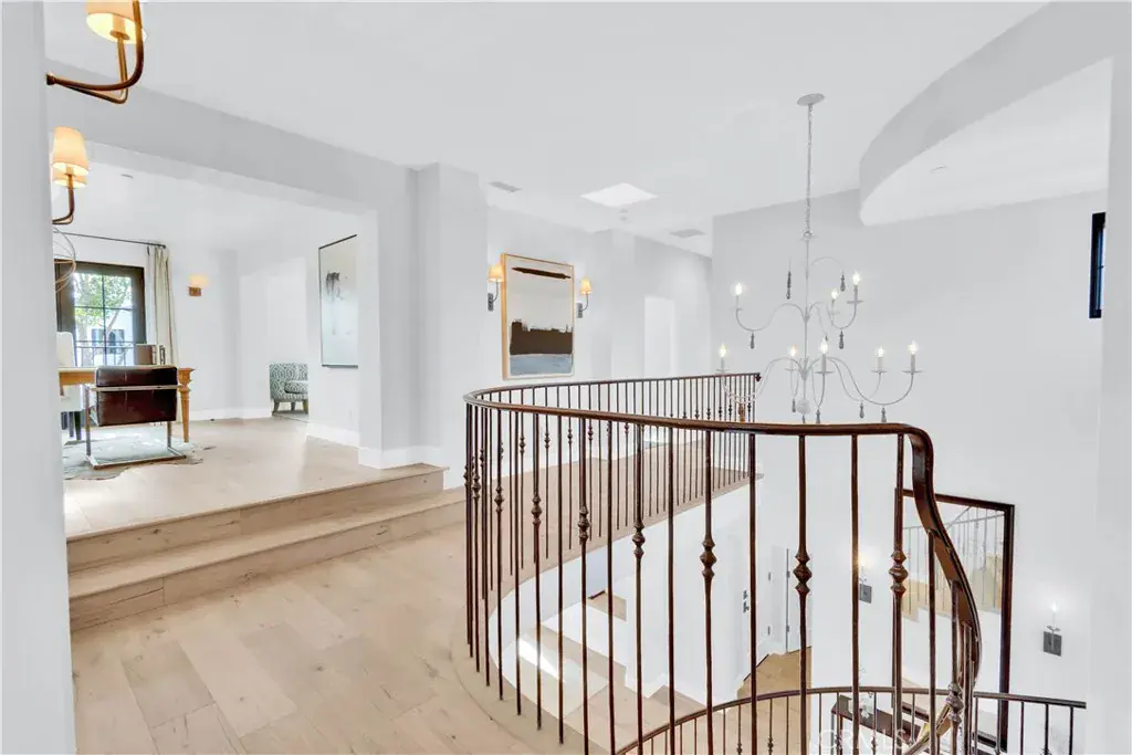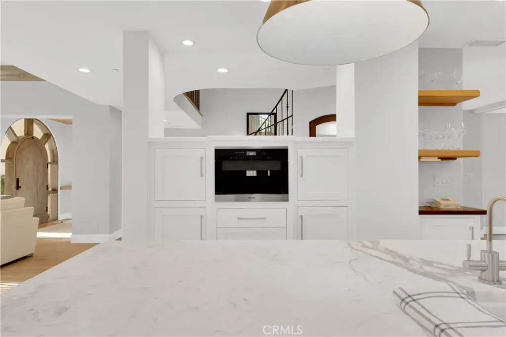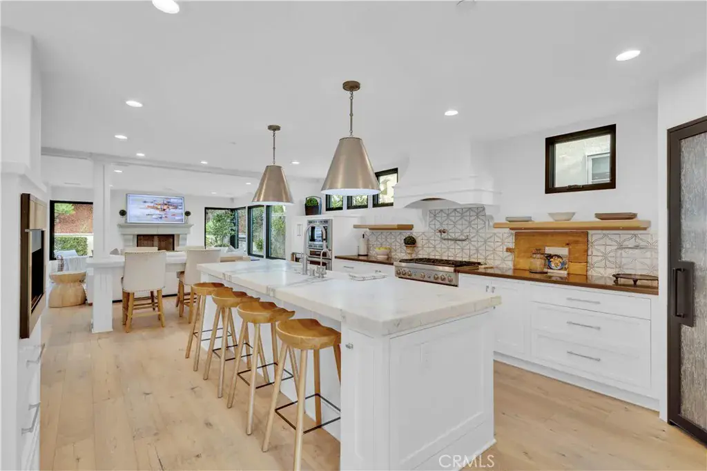 The exterior is clad primarily in Beaumaniere French limestone and features double custom arched entrance doors. Inside, the main living areas feature architectural beams, high ceilings, a wrought-iron circular staircase, and three interior fireplaces, including a carved stone fireplace, a fireplace with a reclaimed wood mantel sourced from Wisconsin, and an electric fireplace in the great room. The kitchen showcases a Venatino Statuario honed marble island, high-end appliances by Miele, Thermador, GE, and Bosch, a built-in Miele coffee system, and an adjacent wine room.
