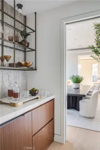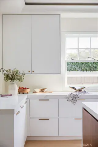 The chef’s kitchen is sculptural yet highly functional, appointed with Viking appliances, expansive stone surfaces, and sleek custom cabinetry. Accordion glass doors open to newly designed outdoor spaces, where Garden Studio–designed landscaping and completed pool engineering allow the next owner to finalize a resort-style setting tailored to their vision.