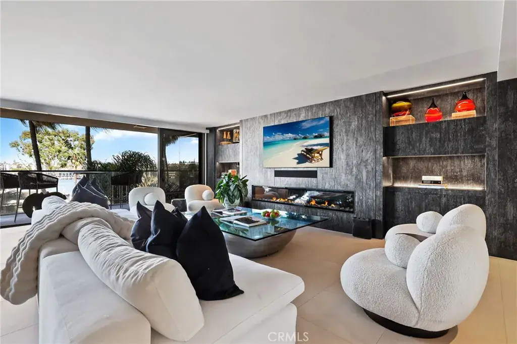 Smart-home features include Lutron lighting, electric shades, and a state-of-the-art entertainment system complete with an oversized electric fireplace, custom cabinetry, and flat-screen TVs with Apple integration.