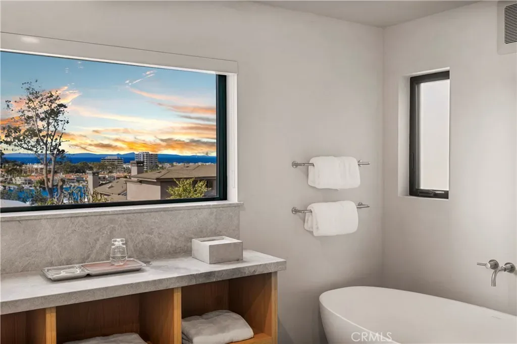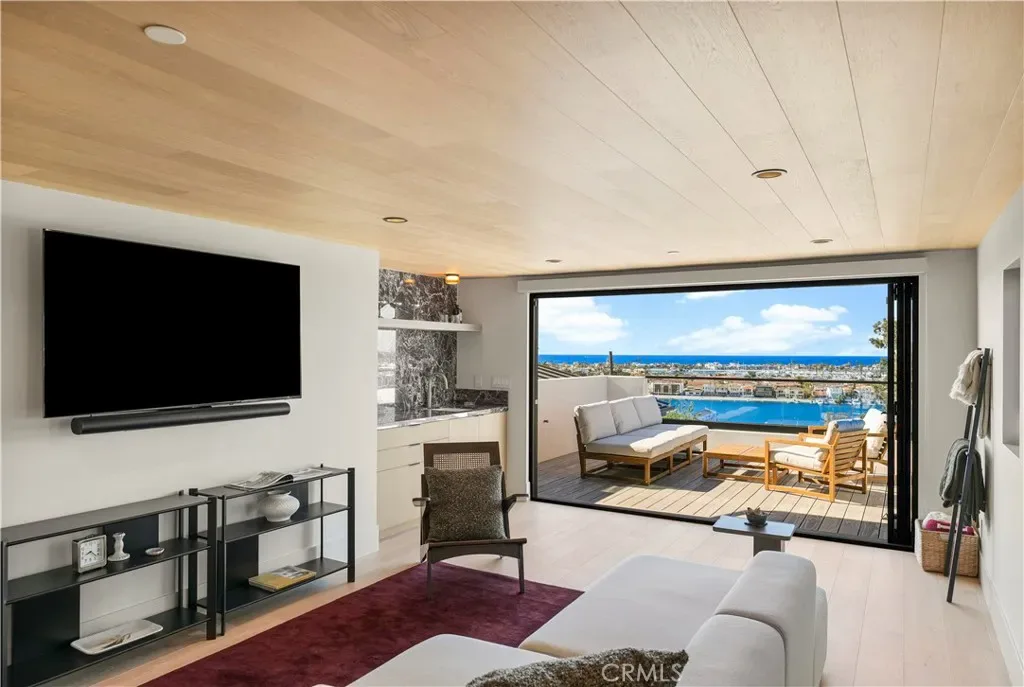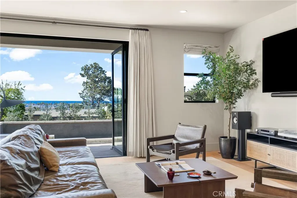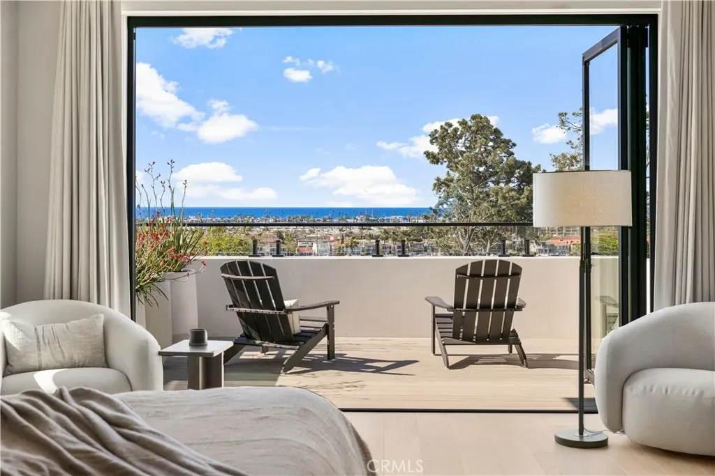 The main level features a chef’s kitchen with Wolf and Sub-Zero appliances, living and dining room, two bedrooms and bathrooms, and an ocean-view office. The second level offers a serene primary suite with panoramic views from both bedroom and bathroom, an additional bedroom and bath, secondary living space, and access to the ADU. The ADU provides a full kitchen and studio-style living, perfect as a private office, guest suite, kid’s play or media room, or in-law quarters. The third-floor loft with bath and expansive deck offers some of the best views Newport Beach has to offer.