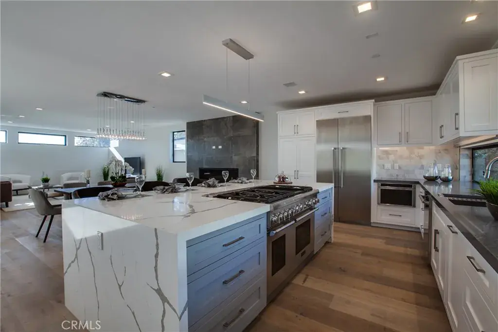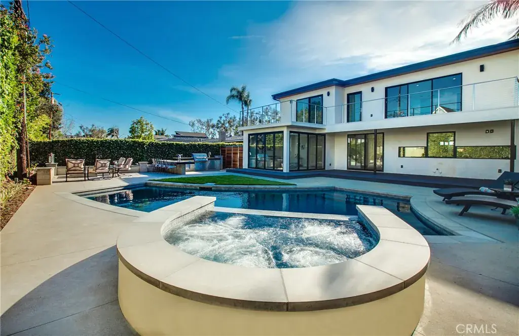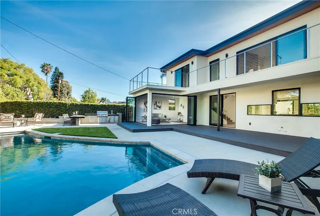 yard and deck. A 6 foot wide glass entry door leads you into the large open concept designed great room with large living and dining areas and chef’s kitchen. The over-sized island with commercial grade stove, stainless steel appliances, and wine station looks out to the festive back yard and to the main living room and dining area with contemporary fireplace. A game room is open to the main rooms while disappearing glass doors open onto the large back yard…ready for fun in the salt water pool and spa with wireless control, built in BBQ with a granite buffet table adjacent to the firepit. Fully wired for a scalable audio/video/security system, this home includes a powder room and one bedroom suite on the main floor while the upstairs includes a large primary suite with fireplace and opens to a private deck over looking the pool. Three additional bedroom suites along with a laundry area round out the upper level. The home totals 5 bedroom suites (including one secondary bedroom with private stair case and deck, 5.5 baths, spacious great room, and game room. Designed for entertaining a crowd with easy indoor/outdoor living, this property is ready for summer fun.