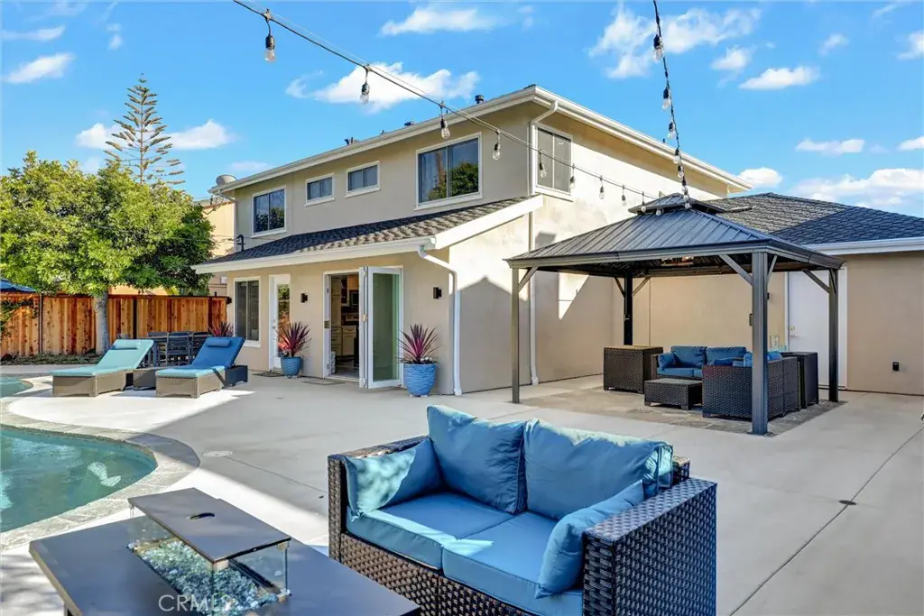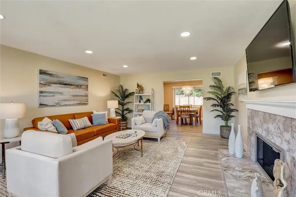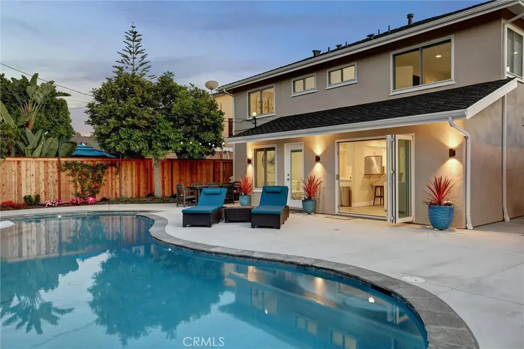 The Kitchen is a home chef’s dream all of the kitchen furnishings are included such as dishes, glassware, flatware, cooking tools, cookware, bakeware and more! The Family Room, which is outfitted with a sofa, occasional chairs and a smart TV, is extra special as it extends to indoor outdoor living, with an eight foot three panel folding door which leads to an incredible backyard, featuring a sparkling new pool with two chairs on a baja shelf two chairs, chaise lounges, outdoor dining table for six, fire table with love seats, a pergola with casual seating, a gas BBQ. This place has everything you need for resort style living! The elegant Dining Room includes a table with seating for six, a buffet table and a gorgeous shell chandelier. Perfect for dinners with family and friends. This super comfy Living Room, with plenty of seating, includes a large faux leather sofa, occasional chairs, a Smart TV, dimmable lighting, and a cozy gas log fireplace. It’s perfect for relaxing, reading, game night or movie night!