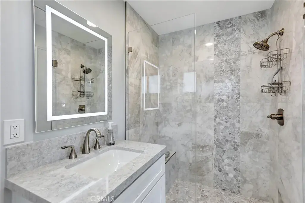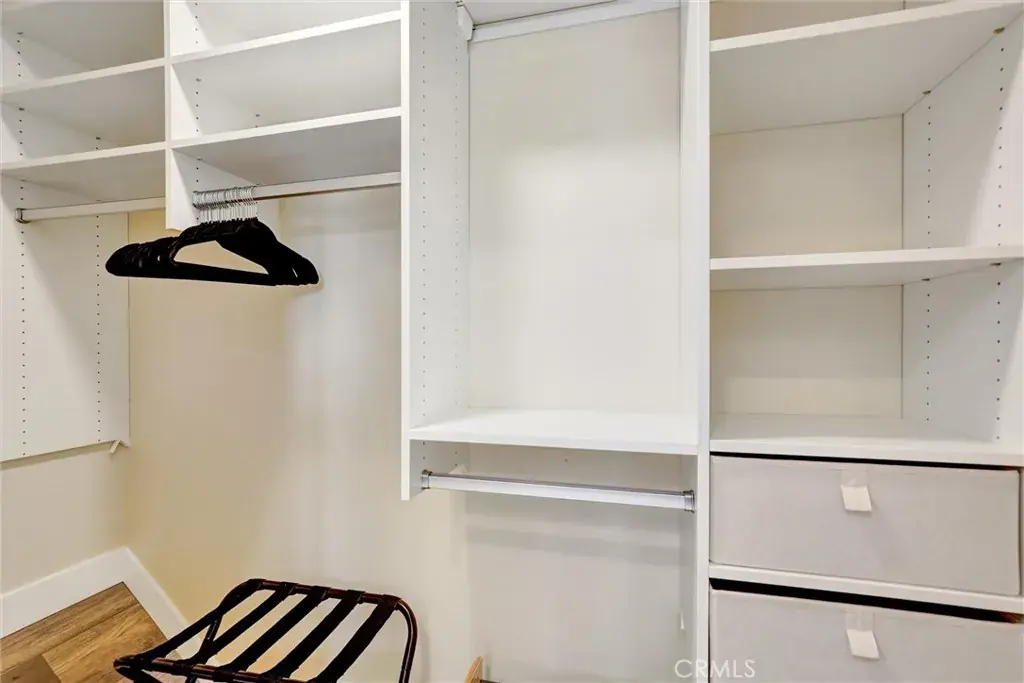 Upstairs, you’ll find a large primary bedroom decorated with the most relaxed and calming natural color palette and includes a gorgeous en suite bathroom. There is a large closet with great lighting, custom cabinets, plenty of space for clothes on hangers, mirror, and a vanity.