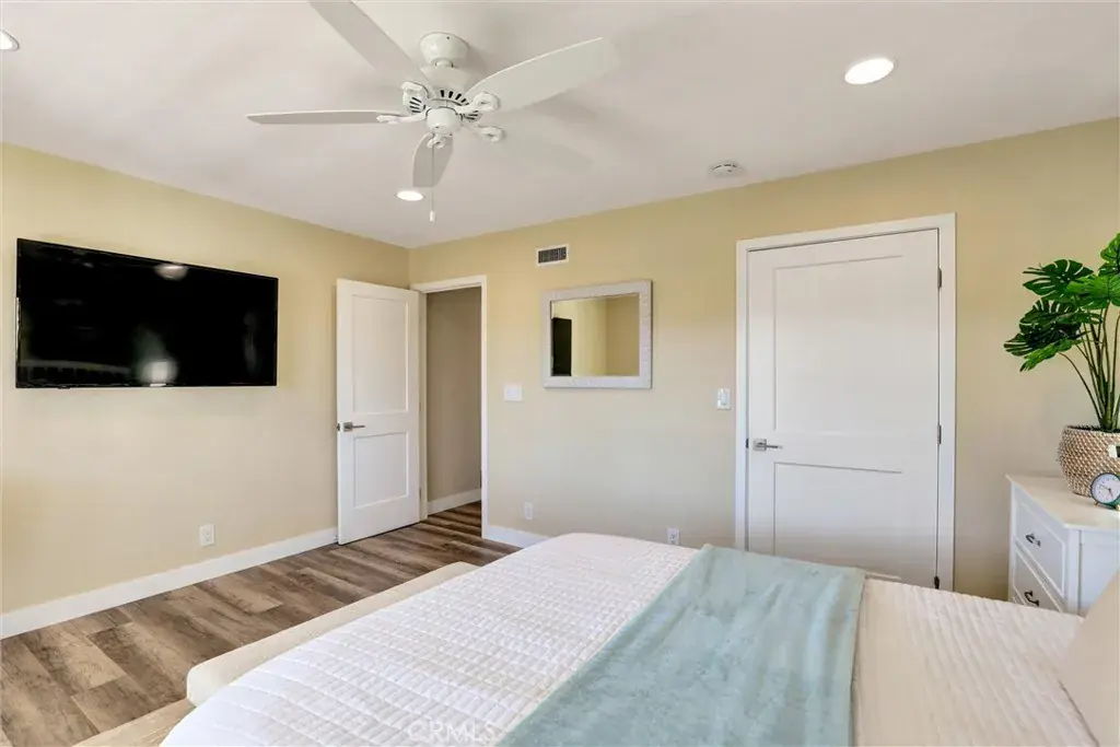 On the first floor is a large bedroom with a desk, ceiling fan, wall mounted Smart TV, dressers and closet, and attached full bathroom.