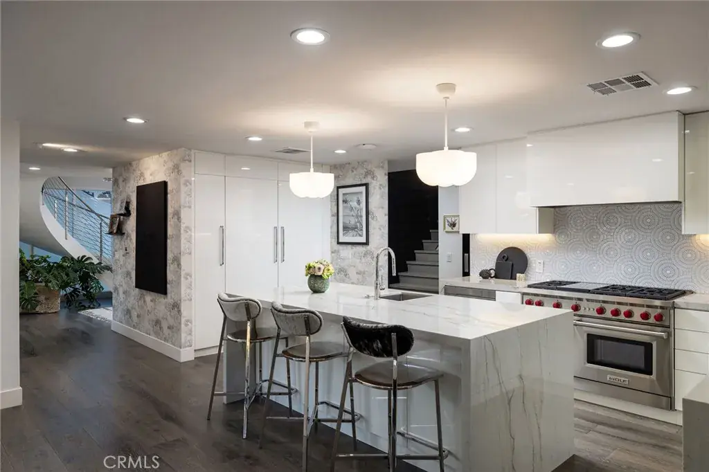 Indoor-outdoor flow continues into a waterfront dining room anchored by a statement Bocci chandelier crafted from hand-blown glass. Culinary pursuits are elevated in a custom gourmet kitchen featuring waterfall-edge onyx countertops, bespoke cabinetry, a wet bar, Wolf range, built-in Sub-Zero refrigeration, high-top seating, and a Sub-Zero wine cooler.
