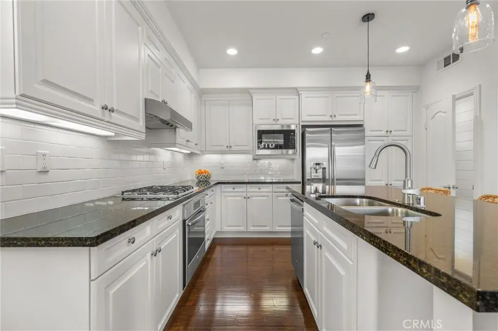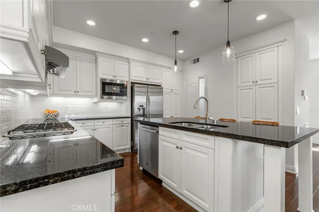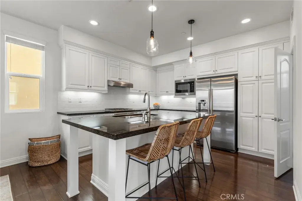 Gourmet Chef’s Kitchen: Featuring an expansive center island with breakfast bar seating, elegant Granite/Quartz countertops, modern stainless steel appliances (including a Refrigerator, Washer, and Dryer), and ample cabinet space.