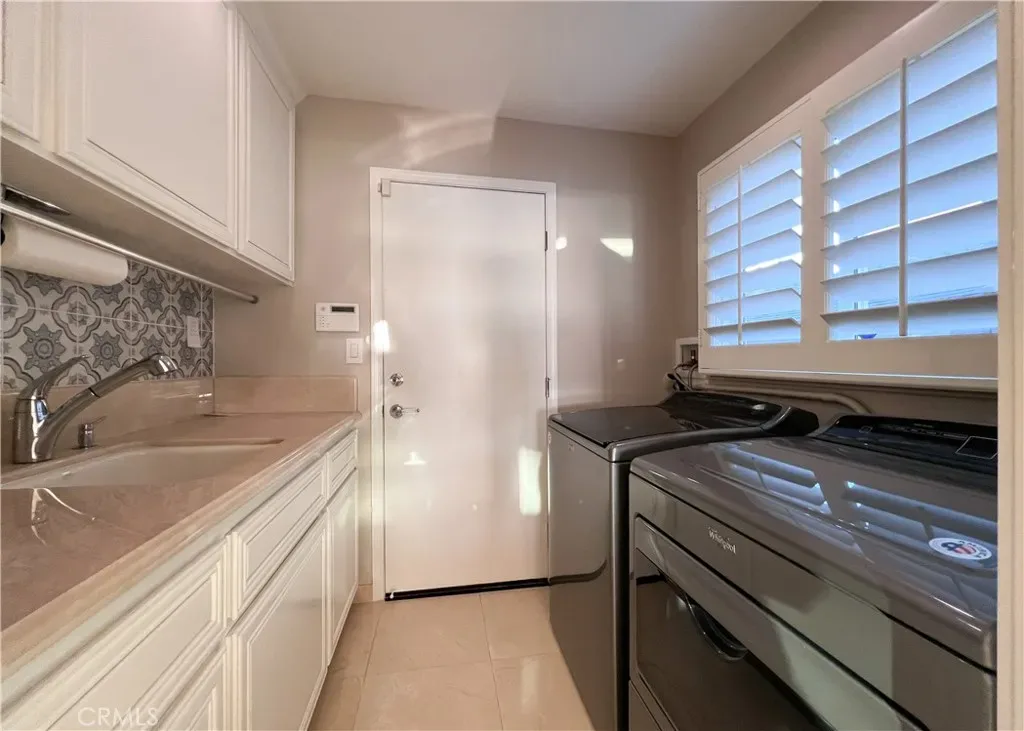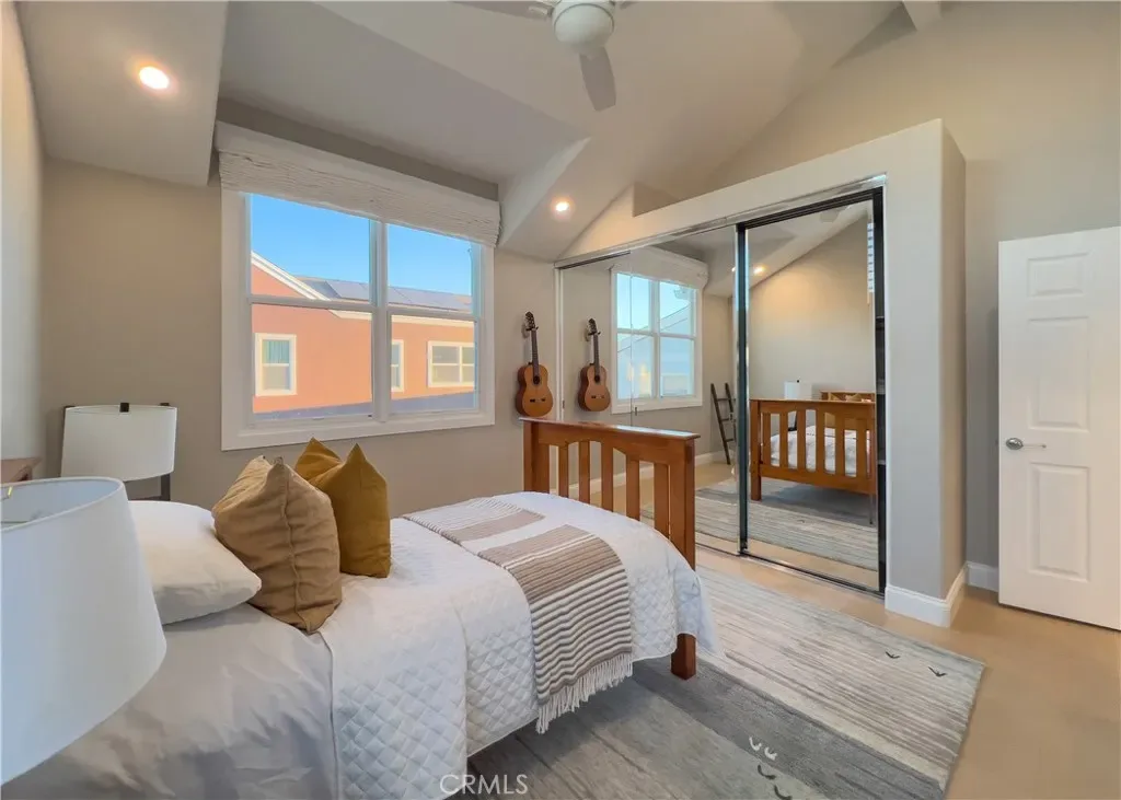 Two additional guest bedrooms offer vaulted ceilings and hardwood flooring, with one currently configured as a home office with custom built-ins. Additional features include a security system, motorized awnings, custom window treatments, outdoor beach shower, whole-house water system, landscaped patios, and an epoxy-finished two-car garage.