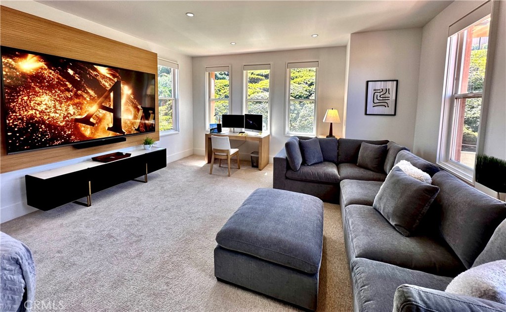 Upstairs includes two bedrooms, a full bath, and a spacious bonus room/office (optional 4th bedroom) with a 100” TV—ideal for guests or remote work, Desk and Printer included.