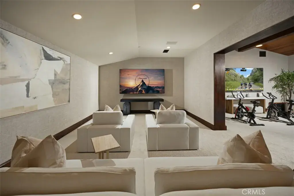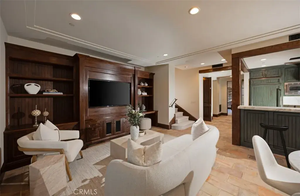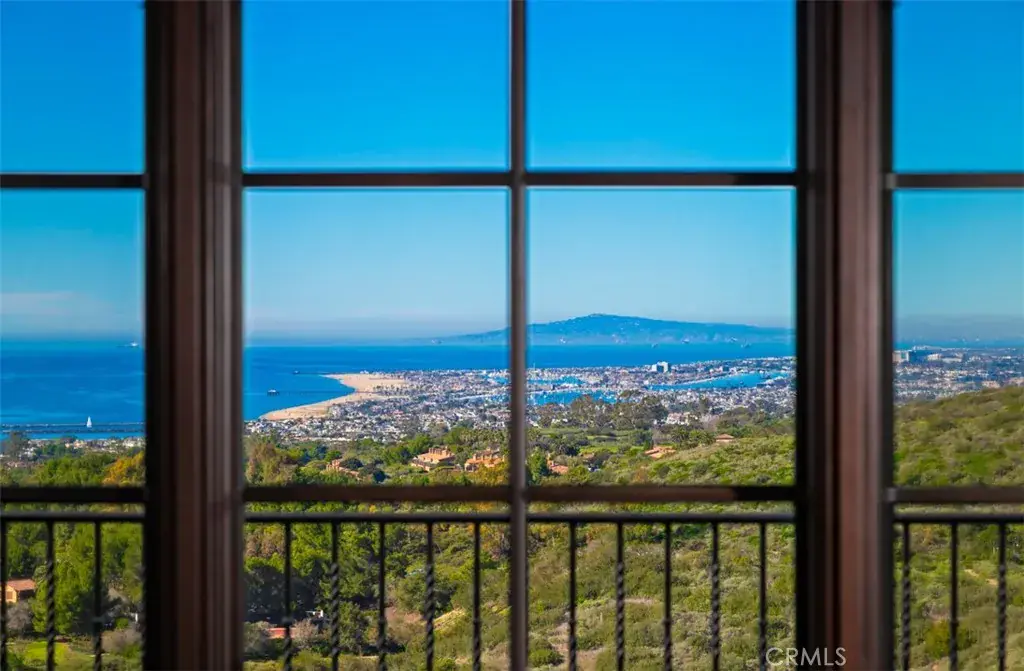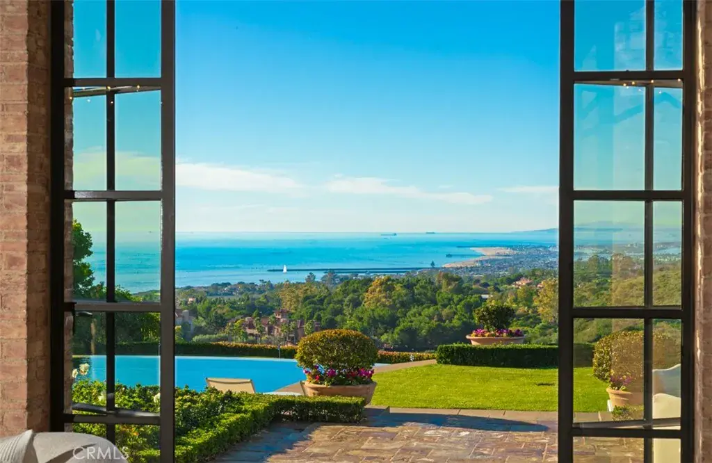 A gated entry introduces curated design with textured finishes, symmetry, custom built-ins, and refined architectural details. The Great Room frames panoramic ocean views through steel-framed windows, extending toward Palos Verdes and Long Beach. An enclosed indoor/outdoor loggia creates a year-round living and dining retreat.