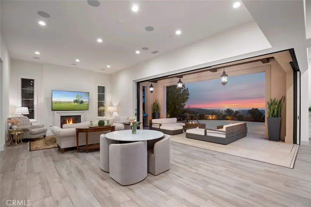 The main level is centered around a light-filled great room with soaring ceilings and seamless indoor-outdoor flow through retractable glass doors. A sleek fireplace anchors the space, opening to the dining area and chef’s kitchen with a large center island and premium appliances.