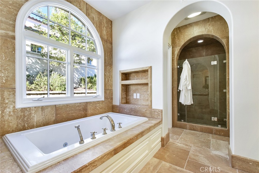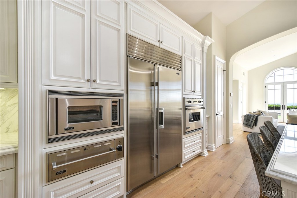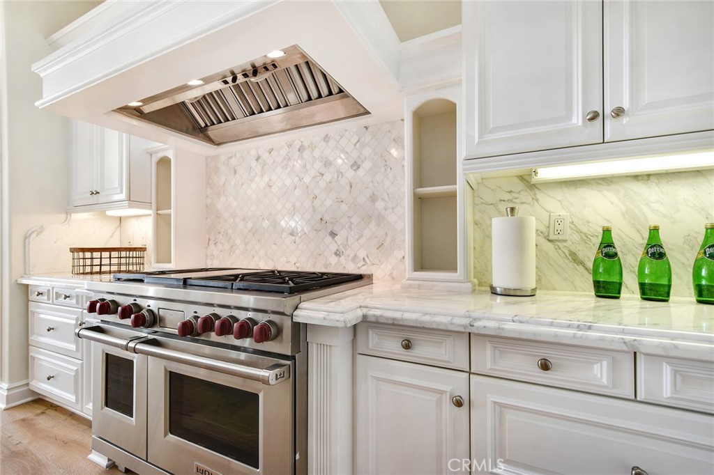 A gated front courtyard welcomes you to the property, where a charming detached casita offers an ideal retreat for guests. Inside, sun-drenched living spaces feature an inviting blend of formal and informal rooms designed for both everyday comfort and refined entertaining. The gourmet kitchen is a chef’s delight, appointed with a Wolf range oven, Sub-Zero and Viking appliances, and Calacatta Oro marble countertops with hand-distressed edges. The spacious owner’s suite, privately situated at the rear of the home, opens through French doors to the backyard oasis and showcases a spa-like bath and ample closet space. Three additional en-suite bedrooms, including the casita, provide exceptional flexibility for family, guests, or office use.