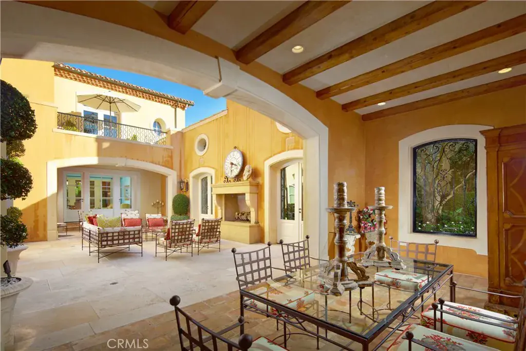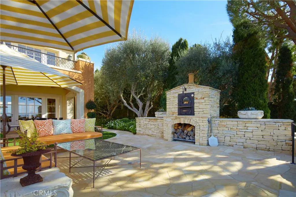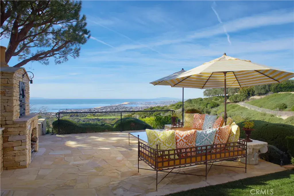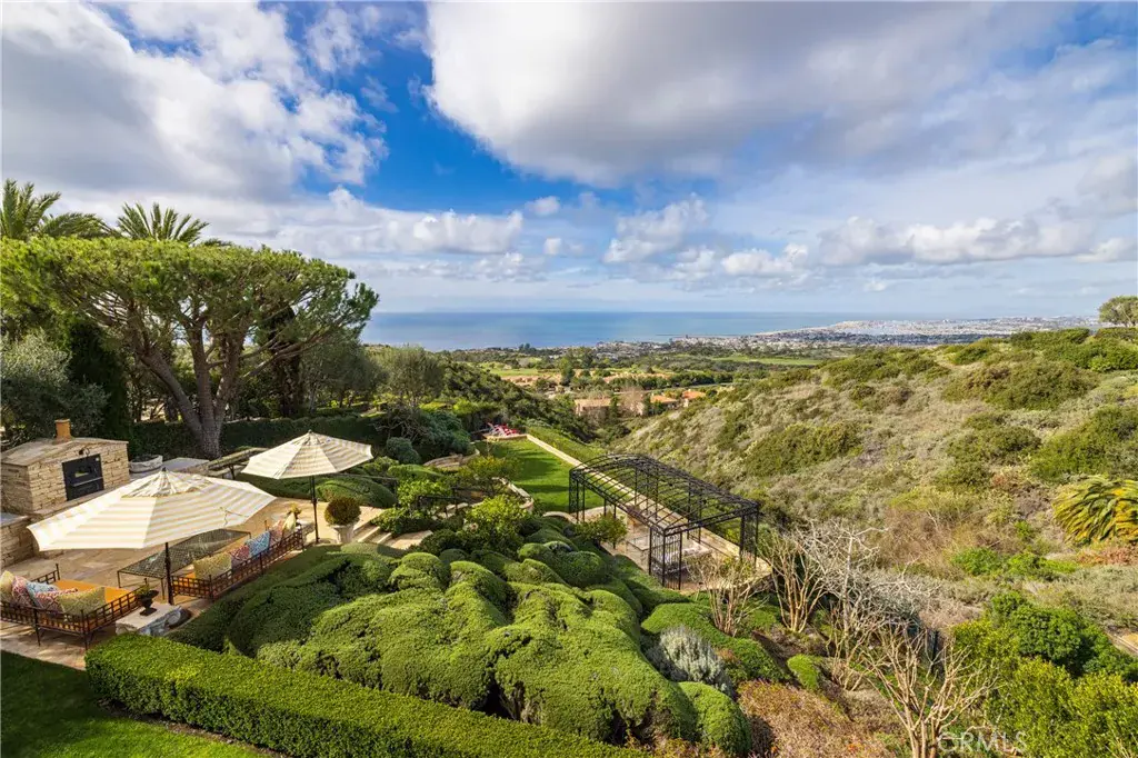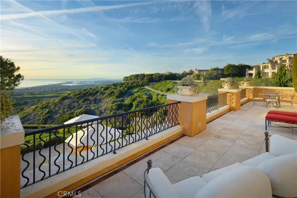 Ever-changing by day and night, the phenomenal panoramic views of ‘Villa Saffron’ are in a league of their own. They are experienced from both levels of the St. Tropez-inspired villa at guard-gated Pelican Crest in Newport Coast. The immersive vistas stretch across lush fairways, a canyon, the azure waters of the Pacific Ocean, Newport Harbor, San Clemente and Santa Catalina Island. Enchanting city lights reach as far as Palos Verdes. The terraced grounds tower 604 feet above sea level. They command front-row views that complement a backyard with upper and lower terraces, four lawn areas, loggias, custom fireplace/wood-burning pizza oven. The outdoor kitchen features a built-in 48″ Lynx BBQ. Located close to the end of a private cul-de-sac, the villa showcases exquisite landscaping, a walled and gated front yard with a limestone colonnade pool, and a large, fireplace-warmed atrium. Spanning nearly 26,092 SF, the estate’s sumptuous homesite by EBTA architects, built by PrideMark, compliments an opulent interior that extends approximately 8,176 SF. It features four en suite bedrooms (one at entry– currently used as an office), four full baths, and two half baths. An inviting foyer and grand staircase provides an elegant introduction to living areas including a media room, sunny office with enchanting views, a circular formal dining room surrounded by columns, and a spacious great room with an ornate hand-carved limestone fireplace. The chef’s kitchen boasts an oversized island, ocean-view breakfast room, butler’s pantry, two sinks, stone countertops, custom cabinetry, built-in side by side Sub-Zero refrigerator/freezer, steam oven, six-burner Wolf range, and double ovens. Note worthy materials include stone imported from France and Italy, antique French pavers, French white oak flooring, along with custom-made steel windows and French doors. All rooms except the media room offer access to an outdoor patio, terrace, loggia, or Juliet balcony, with the ocean-view primary suite boasting two decks, pocket doors at its entrance, a sitting room, two walk-in closets with custom built-ins, retractable sun shade, and luxe bath featuring a soaking tub and separate shower. Additional highlights include a 350+ bottle temperature-controlled wine cellar, wet bar, EV charging, full house water filtration and soft water by Water Techniques, Sonos sound system, Lutron lighting, as well as the option to build an ADU on the terraced lot with a spectacular view.