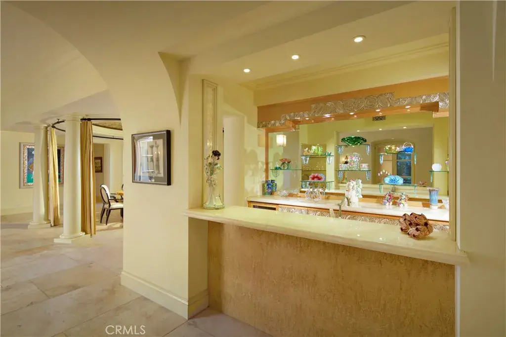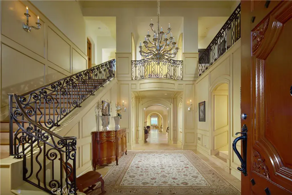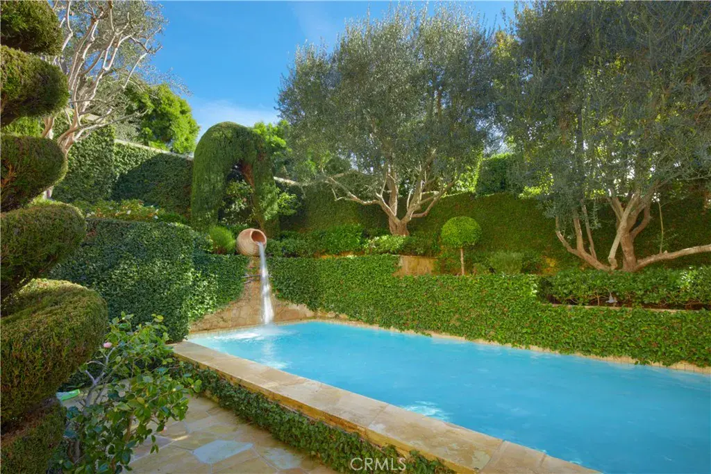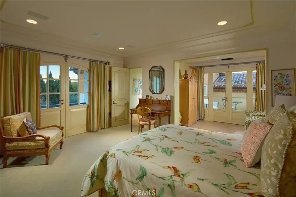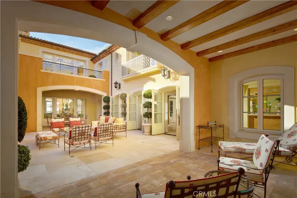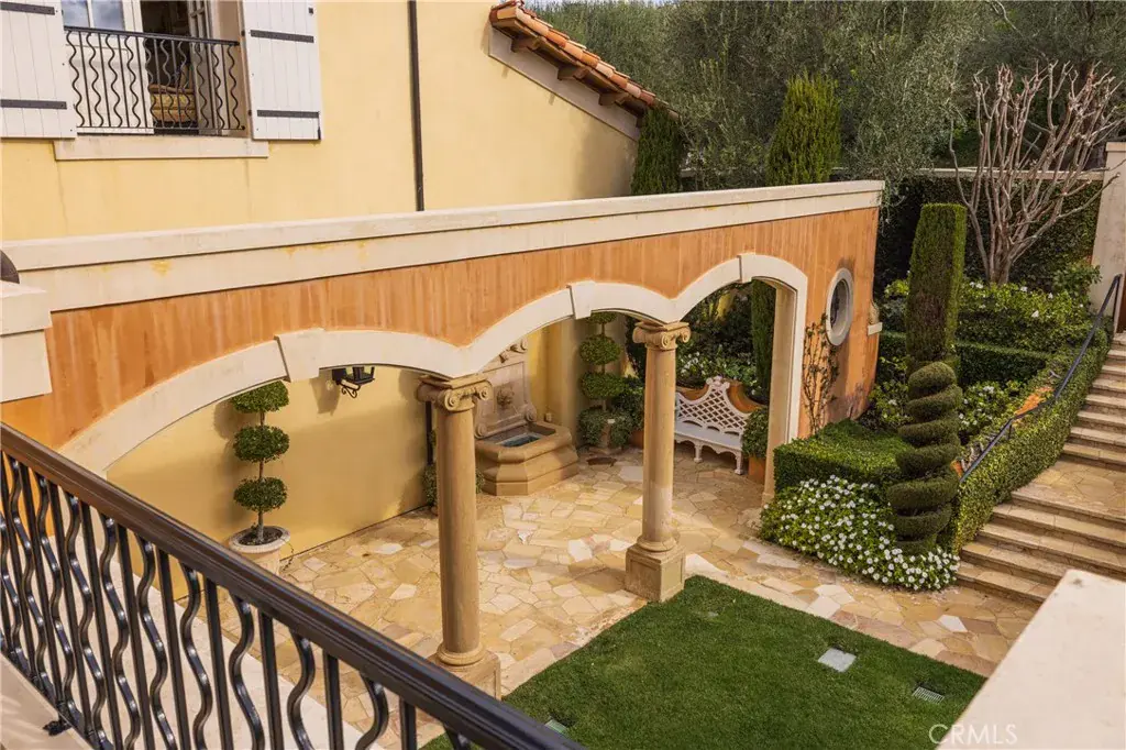 Ever-changing by day and night, the phenomenal panoramic views of ‘Villa Saffron’ are in a league of their own. They are experienced from both levels of the St. Tropez-inspired villa at guard-gated Pelican Crest in Newport Coast. The immersive vistas stretch across lush fairways, a canyon, the azure waters of the Pacific Ocean, Newport Harbor, San Clemente and Santa Catalina Island. Enchanting city lights reach as far as Palos Verdes. The terraced grounds tower 604 feet above sea level. They command front-row views that complement a backyard with upper and lower terraces, four lawn areas, loggias, custom fireplace/wood-burning pizza oven. The outdoor kitchen features a built-in 48″ Lynx BBQ. Located close to the end of a private cul-de-sac, the villa showcases exquisite landscaping, a walled and gated front yard with a limestone colonnade pool, and a large, fireplace-warmed atrium. Spanning nearly 26,092 SF, the estate’s sumptuous homesite by EBTA architects, built by PrideMark, compliments an opulent interior that extends approximately 8,176 SF. It features four en suite bedrooms (one at entry– currently used as an office), four full baths, and two half baths. An inviting foyer and grand staircase provides an elegant introduction to living areas including a media room, sunny office with enchanting views, a circular formal dining room surrounded by columns, and a spacious great room with an ornate hand-carved limestone fireplace. The chef’s kitchen boasts an oversized island, ocean-view breakfast room, butler’s pantry, two sinks, stone countertops, custom cabinetry, built-in side by side Sub-Zero refrigerator/freezer, steam oven, six-burner Wolf range, and double ovens. Note worthy materials include stone imported from France and Italy, antique French pavers, French white oak flooring, along with custom-made steel windows and French doors. All rooms except the media room offer access to an outdoor patio, terrace, loggia, or Juliet balcony, with the ocean-view primary suite boasting two decks, pocket doors at its entrance, a sitting room, two walk-in closets with custom built-ins, retractable sun shade, and luxe bath featuring a soaking tub and separate shower. Additional highlights include a 350+ bottle temperature-controlled wine cellar, wet bar, EV charging, full house water filtration and soft water by Water Techniques, Sonos sound system, Lutron lighting, as well as the option to build an ADU on the terraced lot with a spectacular view.
