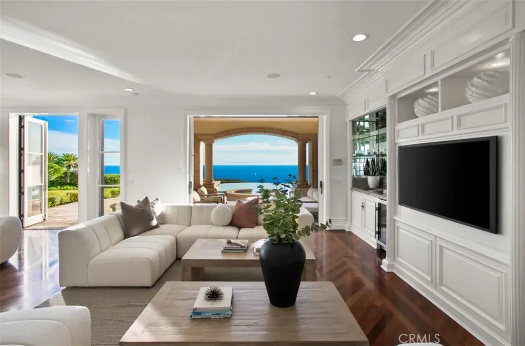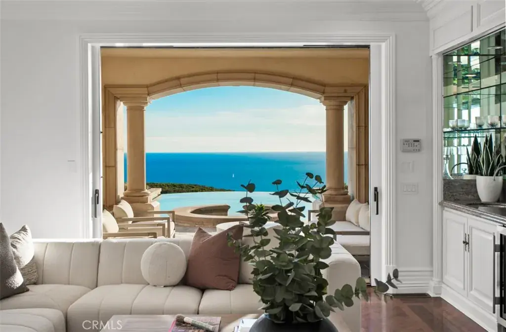 Located within the prestigious guard-gated community of Pelican Crest, this exceptional estate commands uninterrupted views stretching from Catalina Island across the Newport coastline and surrounding greens. Positioned on an expansive 19,000 square-foot corner lot, the property offers a rare sense of elevation and privacy, with manicured, resort-inspired grounds and an infinity-edge pool that visually merges with the Pacific horizon.