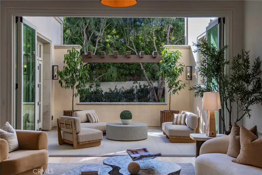 A coveted architectural advantage distinguishes this home from others in Pelican Hill: the resort-style backyard sits directly off the main living level. Walls of bifold doors create seamless indoor-outdoor living, allowing the great room, dining area, and chef’s kitchen to flow effortlessly onto a limestone terrace. Framed by ocean and fairway views, the backyard features a new mini pebble pool and spa, outdoor fireplace, and oversized BBQ island, creating a true main-level resort experience. A refined guest suite completes the main floor.