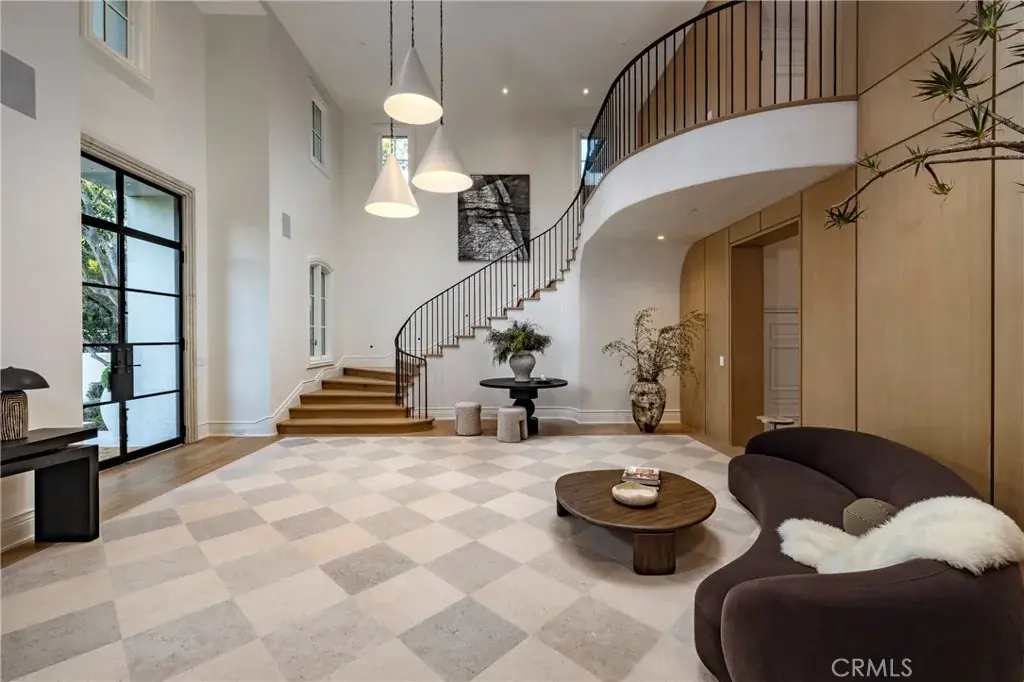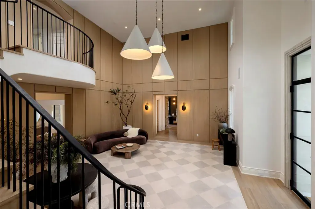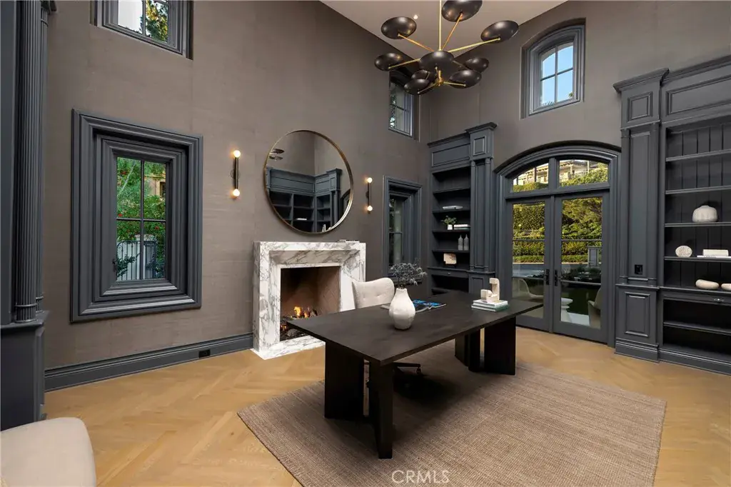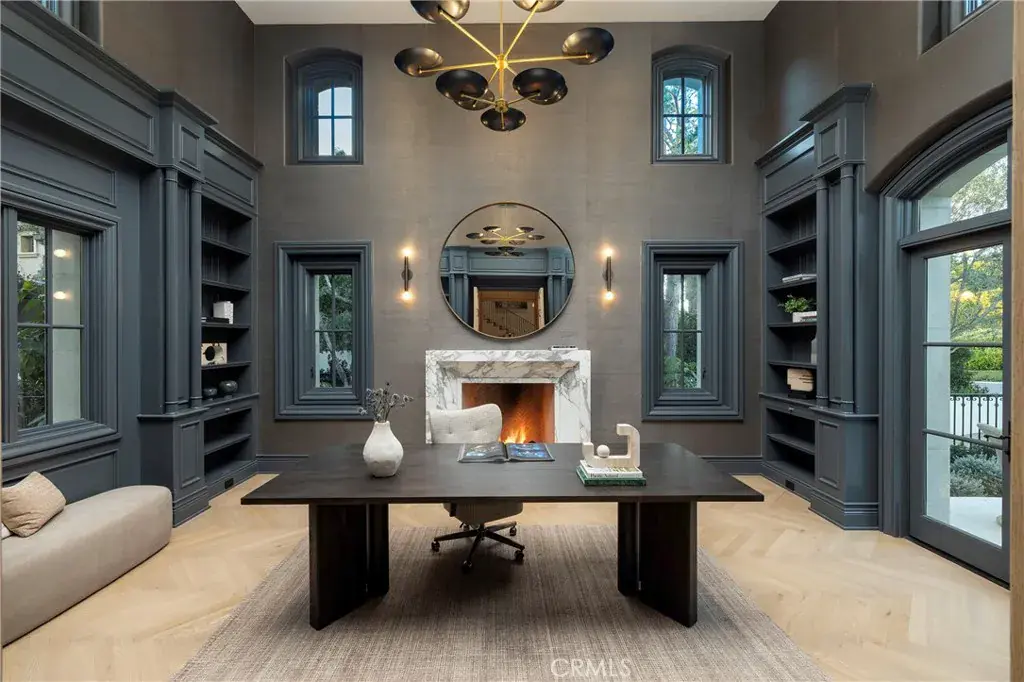 A true sense of arrival begins at the dramatic steel entry doors, opening to a voluminous double-height foyer that immediately sets the tone. Custom chandeliers, bespoke oak paneling, and Venetian plaster walls frame a breathtaking grand entry. Just off the foyer, a striking two-story library with a marble fireplace provides an intimate retreat overlooking the beautifully manicured front grounds.