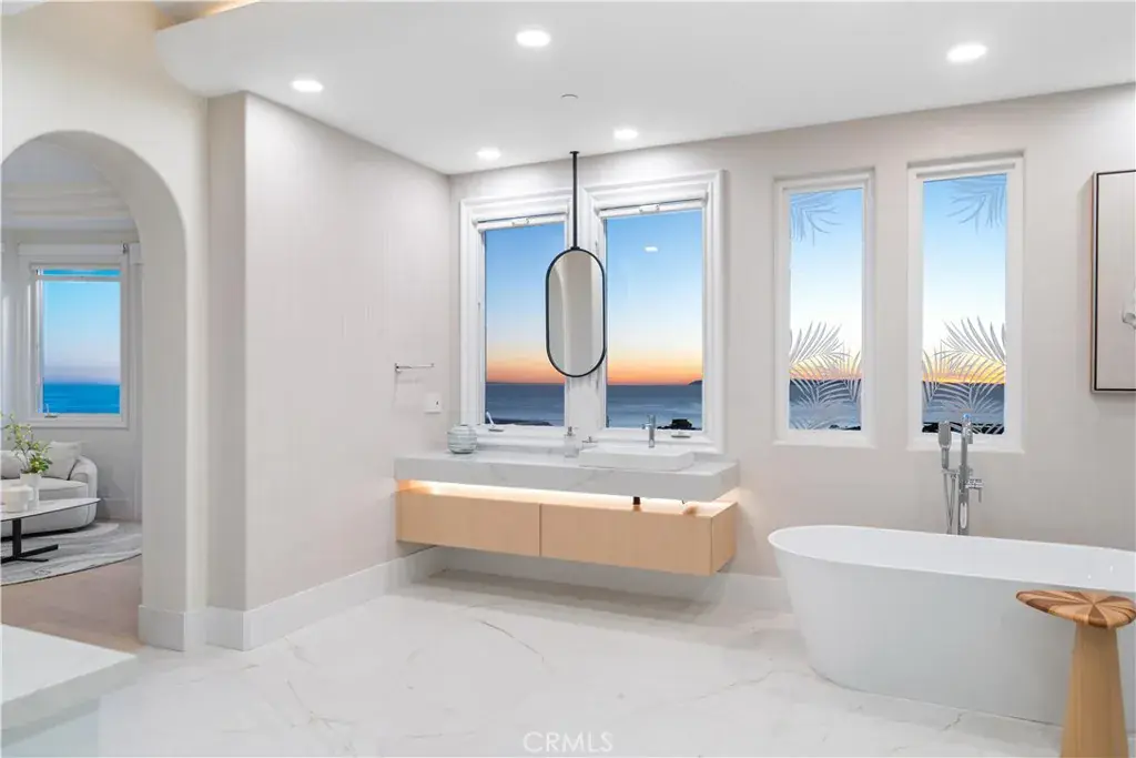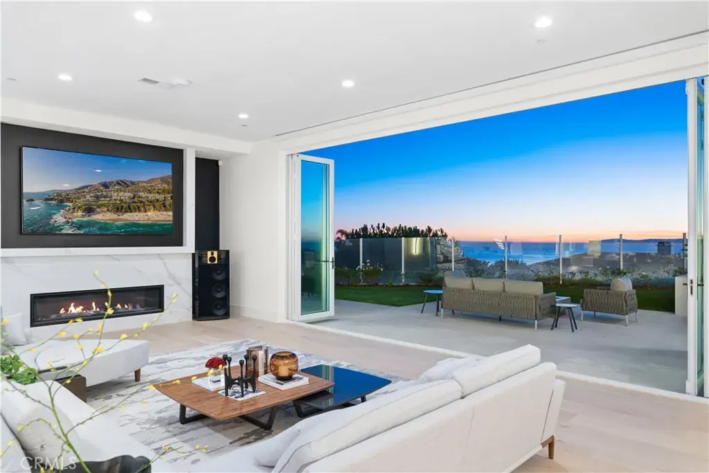 Meticulously reimagined and renovated over the past three years, this residence seamlessly blends contemporary elegance with coastal charm. From the dynamic Pacific Ocean to the lush canyon and verdant fairways of Pelican Hill Golf Course, each vista offers a captivating display of coastal beauty. Step into the foyer to be by a jaw-dropping expanse of nearly 4,000 square feet of continuous open space on the first floor. Fully retractable doors seamlessly connect the indoor and outdoor spaces, creating stunning panoramic views and ample space for hosting events.